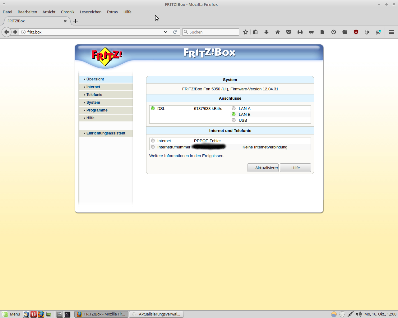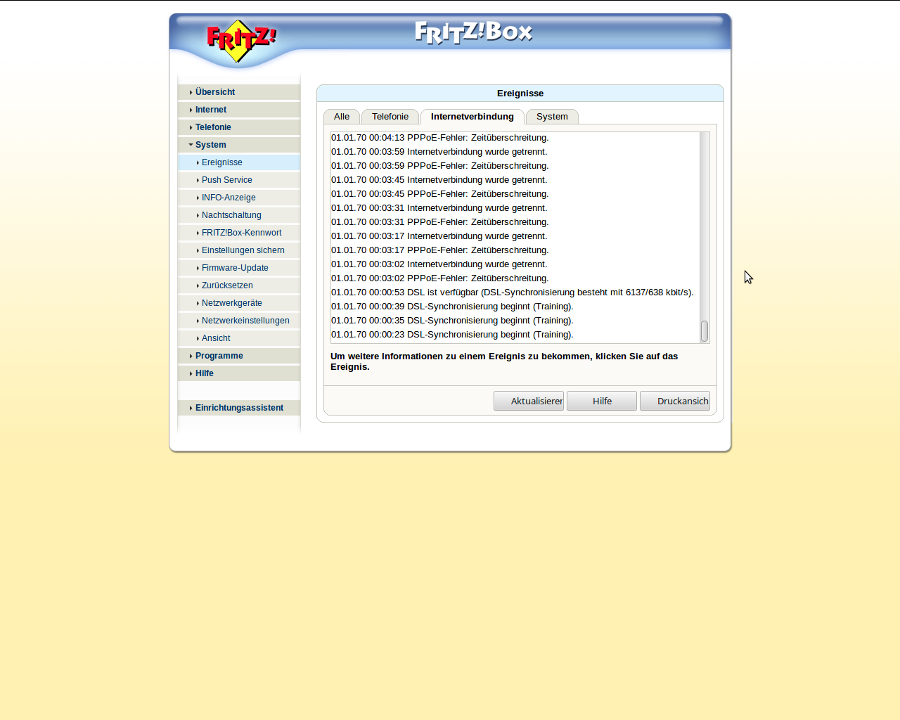 Die Fritz Box zeigt an, dass zwar eine aktive DSL-Verbindung besteht, aber nicht die gebuchte (erkennbar zum einen an der höheren Geschwindigkeit, 6 MB statt normalerweise 1 MB; zum anderen am "PPPOE-Fehler: Zeitüberschreitung"). Der Support meines Providers wollte mir unbedingt einen Telekom-Techniker nach Hause schicken, was ich aber zunächst mal für unnötig hielt, weil es sich offenbar nur um eine Verschaltung des Anschlusses (z.B. am DSLAM-Verteilerkasten) handelt. Die kann ja u.U. auch per Fernwartung korrigiert werden. (In Internetforen wurden Beiträge gepostet, nach denen Telekom-Techniker bei einem derartigen Fehler bis zu 7mal "Endkundentermine" wahrnehmen - und jedes Mal unverrichteter Dinge wieder abziehen mussten. Des öfteren kamen die Techniker auch gar nicht zu den vereinbarten Terminen).