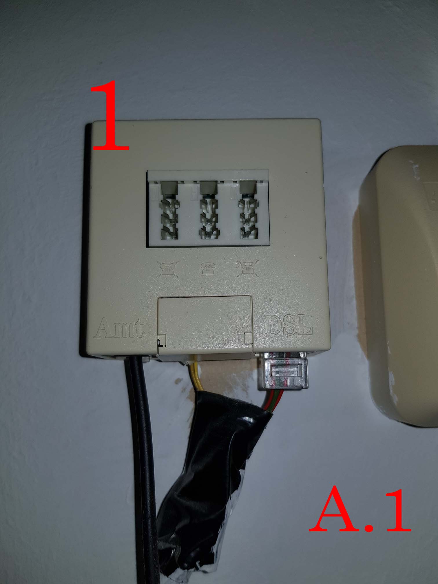 1. Die Haupttelefondose befindet sich im Hauswirtschaftsraum (Bild A). Derzeit ist alles so konfiguriert, wie auf Bild A zu sehen ist. Die FritzBox 7490 hängt an Telefondose 1. Unser Provider ist 1&1 (auch die Vorbesitzerin hatte 1und1). Derzeit läuft alles ohne Probleme. Im Haus ist der WLAN-Empfang zumindest im EG ok, im 1. OG wird es je nach Raum schon dürftig.