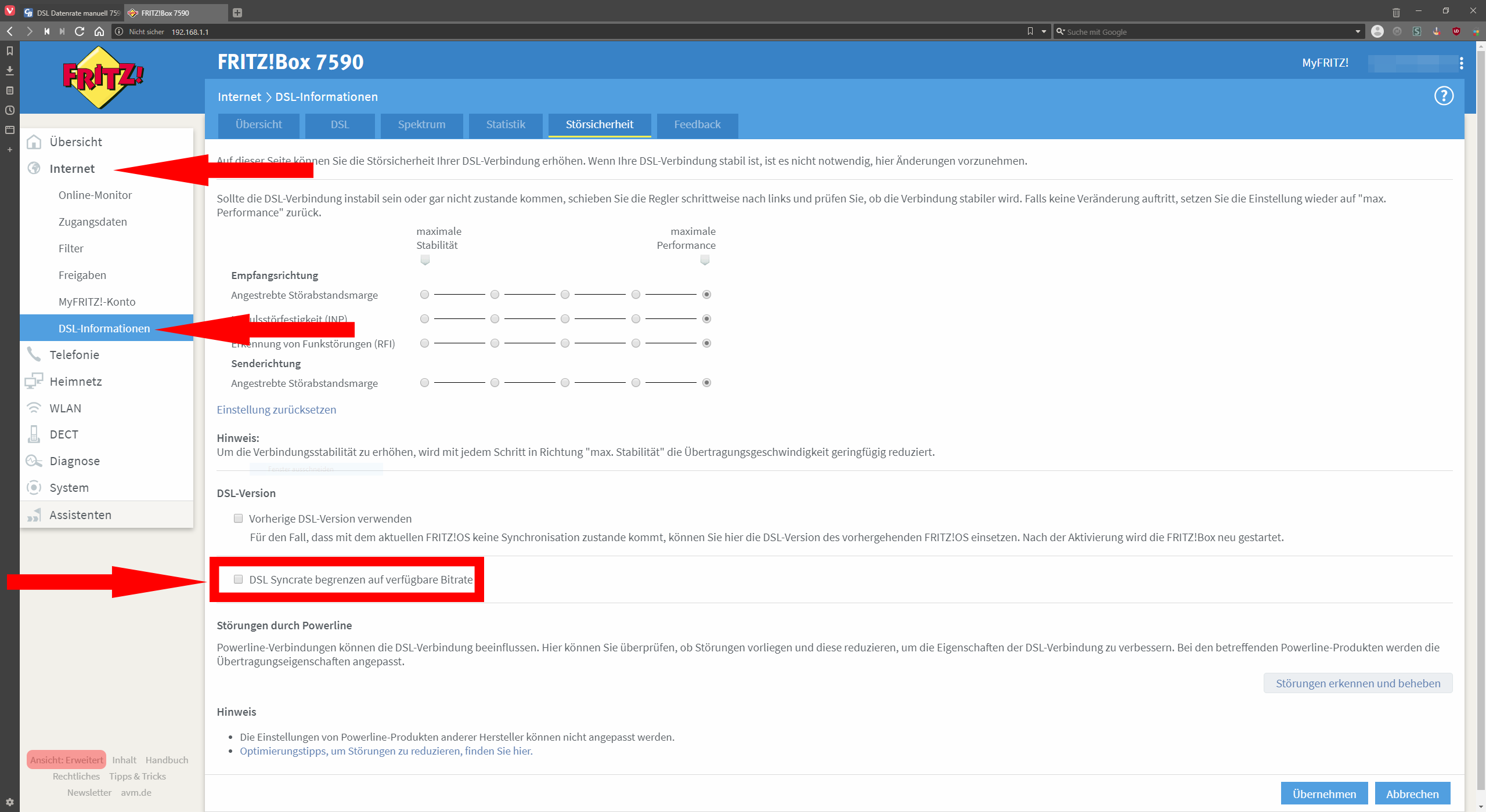 DSL Syncrate begrenzen auf verfügbare Bitrate