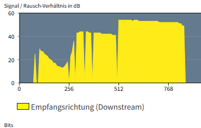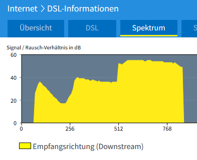 mein DSL Spektrum hat seit kurzem einige Einbrüche im ersten Abschnitt. Um ein lokales Problem im Haus auszuschließen, habe ich kurzer Hand das Spektrum einer weiteren FRITZ!Box, innerhalb der selben Straße, als Vergleich genommen.