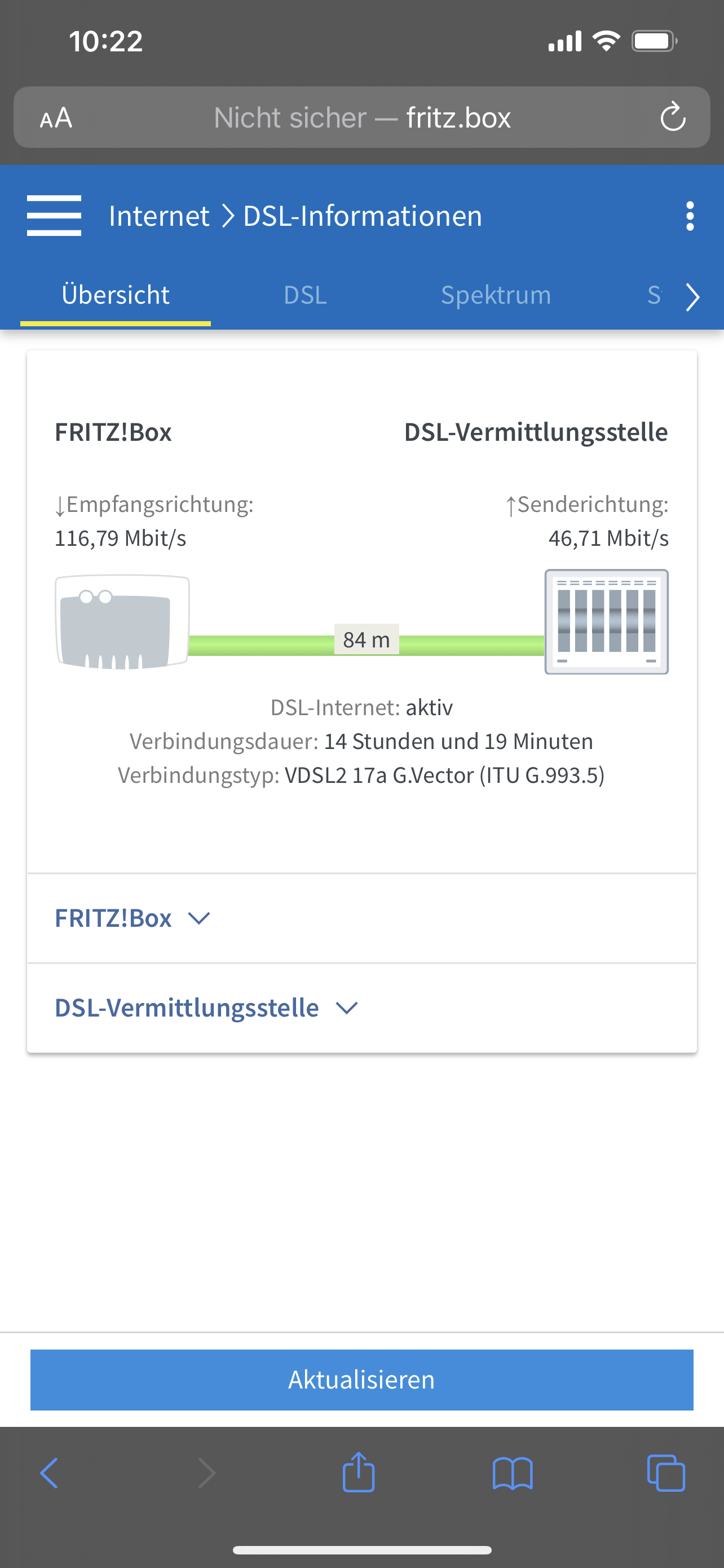 Dann mach bitte mal ein Bild vom Spektrum, der Störabstandsmarge und den Verbindungseigenschaften (Datenrate Min/Max, Leitungskapazität, usw.).