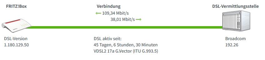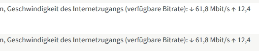 Kürzlich stellte ich fest, dass die Fritzbox nun mit ca. 40 Mbit/s Down- und 9,6 Mbit/s Upload synchronisiert, die Leitungskapazität hat sich laut Fritzbox ebenfalls auf diese Werte erhöht. Leider ist diese Leistung real nicht abrufbar, es bleibt bei ca. 23,5 Mbit/s / 4,5 Mbit/s.