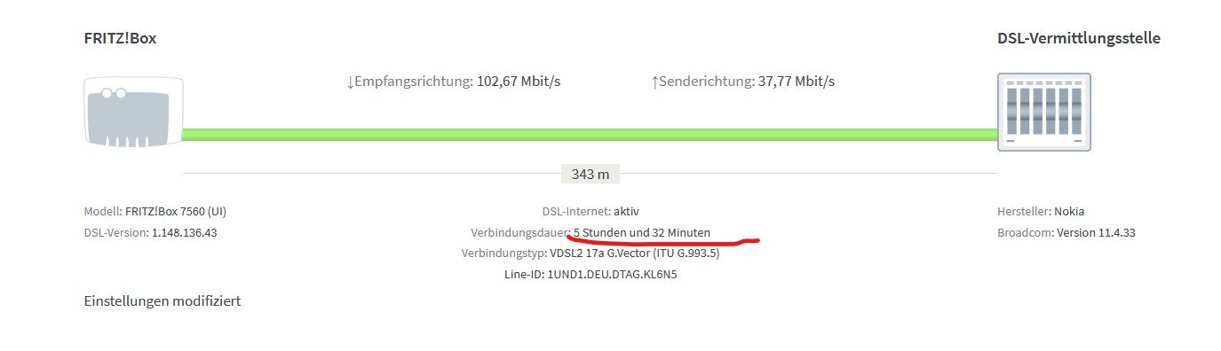 seit über zwei Jahren habe ich nun 100 MBit DSL bei 1&1 mit meiner privaten 7590. Lief stets wunderbar, Sync war immer etwa bei 110 Mbit down und 42 up. Seit einigen Wochen nun habe ich viele Verbindungsabbrüche, gestern waren es über 20.