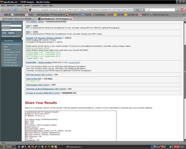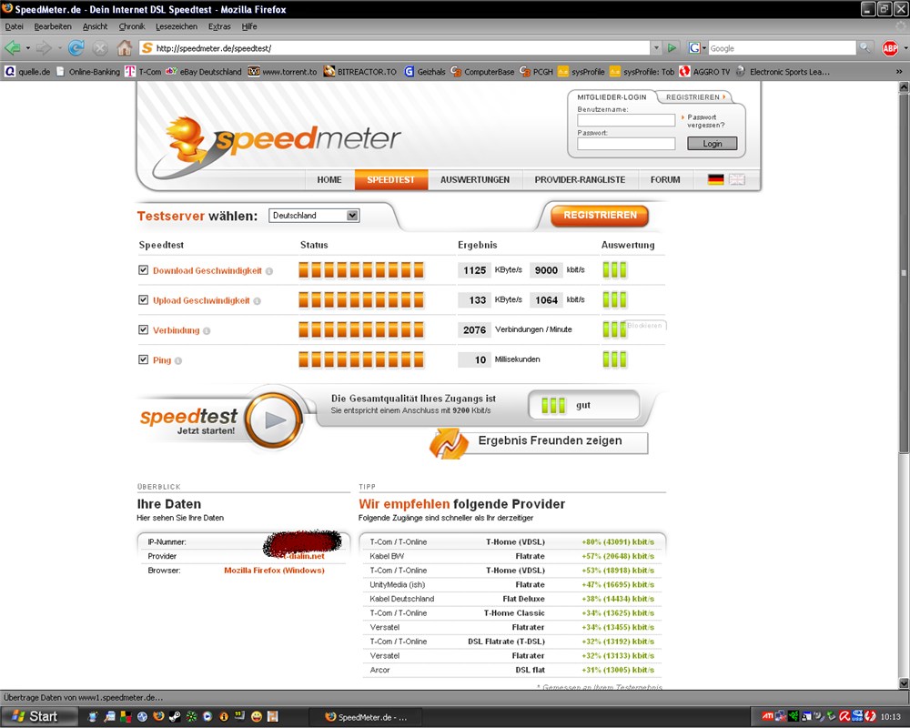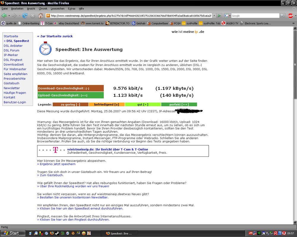 Zum der Testen der neuen Leitung startete ich den Download der Datei T-Online6.0 und kam auf höchstens 1150kbyte/s, nun teste ich meine Leitung mit Speedmeter.de und wieistmeineip.de usw... Doch die Ergebnisse bestätigen nur meine zu langsame Leitung.