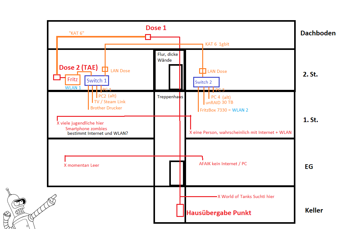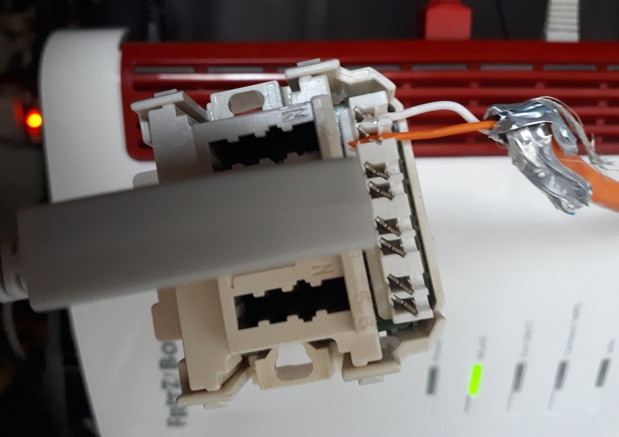 also die TAE bei der Fritzbox liegt noch offen da rum hinterm Tisch (sollte mal "bei der nächsten Renovierung" vernünftig in die wand gebaut werden), kann aber sehen das ZWEI kabel dran sind, an den Dachboden komm ich ohne weiteres im moment nicht ran, da steht jetzt sinnvollerweise ein neuer Schrank so dass die Luke nicht mehr auf geht.