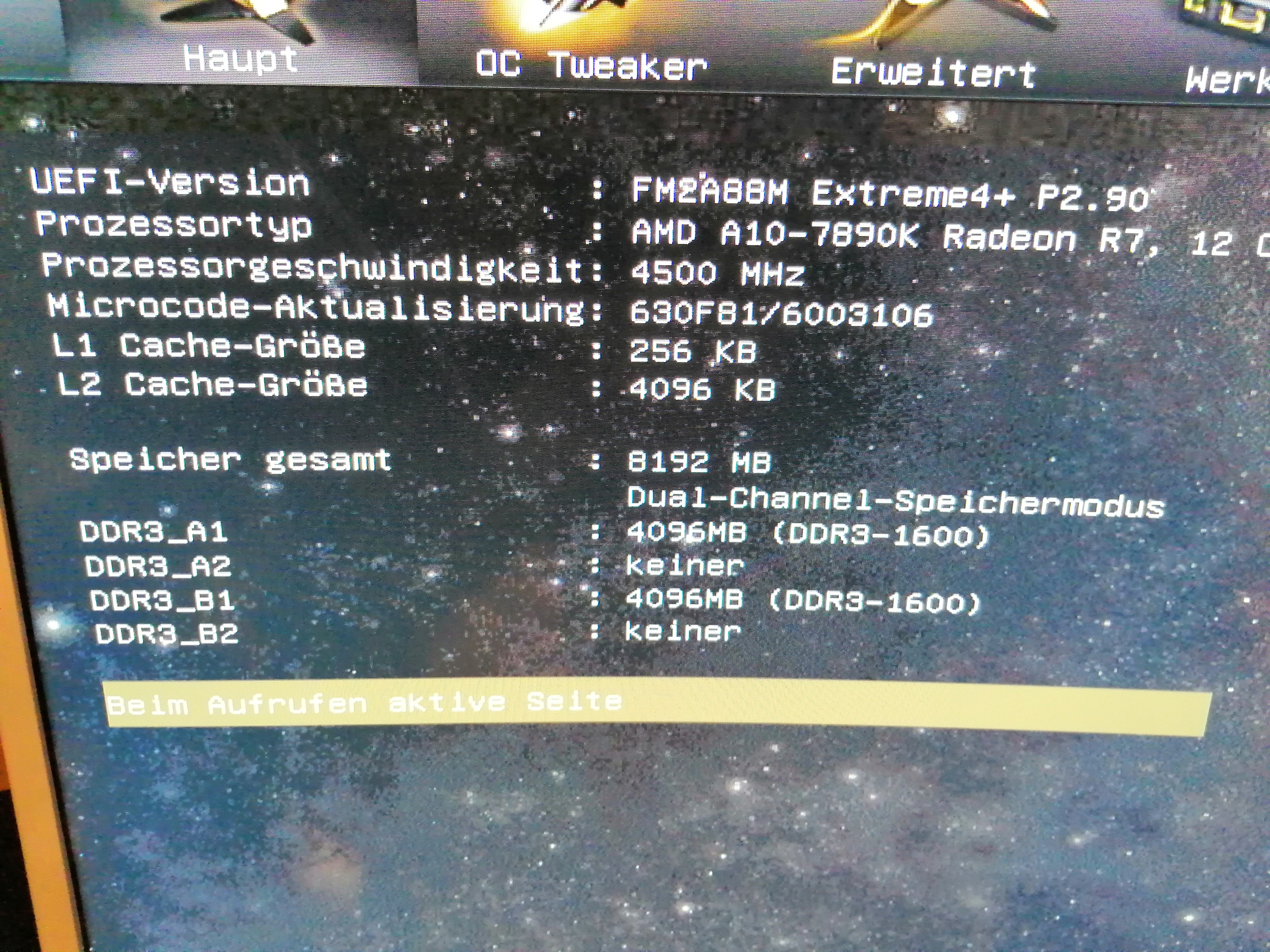 Ich habe ein ASRock FM2A88M Extreme4+ mit einem AMD A10 7890K