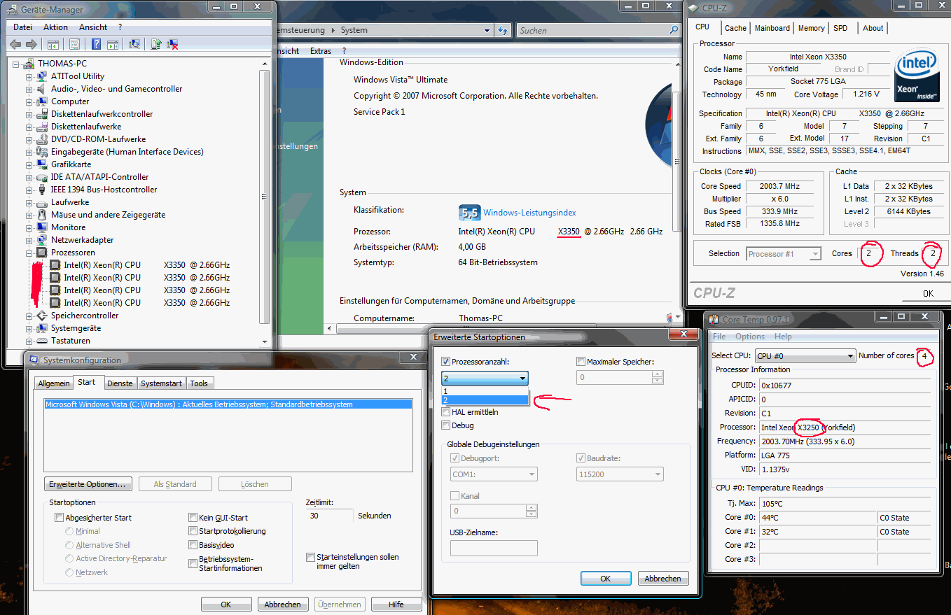 Wie in der Überschirft steht habe ich meinen E2160 gegen einen X3350 getauscht. Läuft auch alles soweit ganz gut nur zeigt der Takmanager nur 2 Diagramme an (Vista Ultimate 64). Was muss ich da umstellen damit ich jeden Kern einzeln sehe?