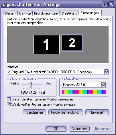ich habe jetzt hier 2 Monitore nebeneinander stehen, einen 19" als 1. und einen 17" als 2. Monitor, funktioniert auch soweit, allerdings hätte ich dazu noch ein paar Fragen.