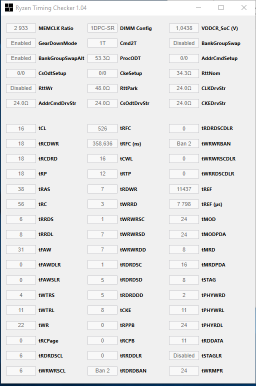 Die Timings für 2933 CL16 habe ich aus verschiedenen Angaben aus dem Internet für Aegis 3000 CL16er Ram entnommen und bei widersprüchlichen Angaben den Mittelwert eingestellt. Die Subtimings sind dabei ganz in Ordnung aber natürlich weit von "optimiert" entfernt....eben das was man bekommt wenn man das docp Profil lädt und es so lässt.