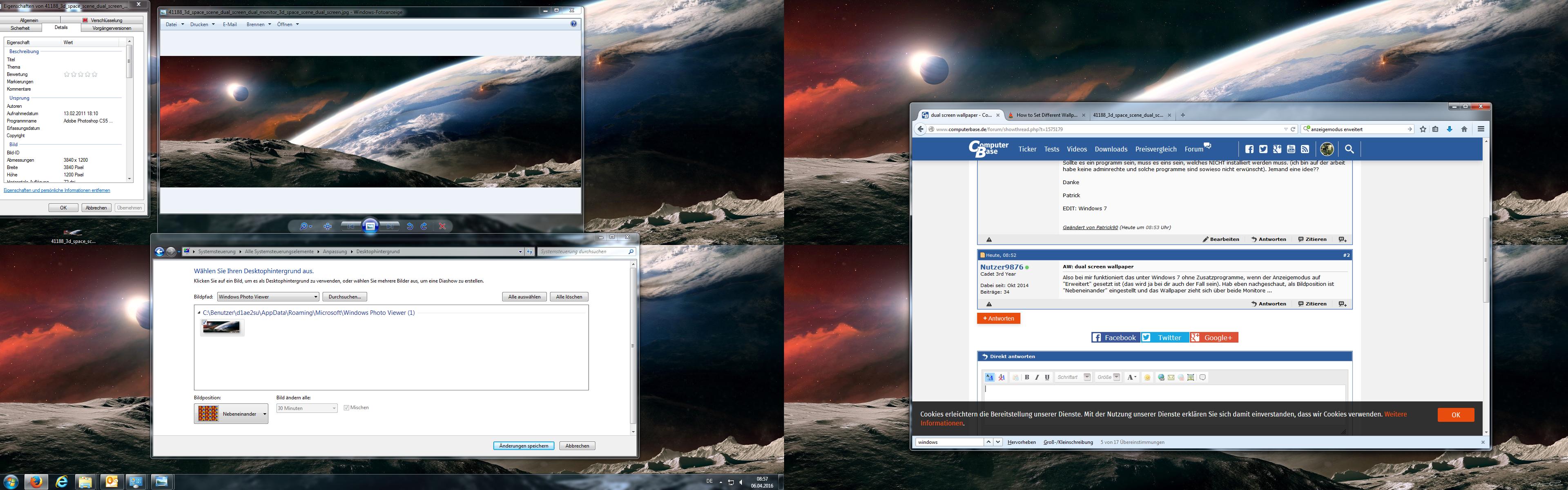ich hätte gerne ein 3840x1200 widescreenwallpaper über meine beiden Bildschirme. Wenn ich das ganz normal über windows einrichte, (egal ob gestreckt, nebeneinander oder zentriert) habe ich auf beiden seiten das gleiche Bild.