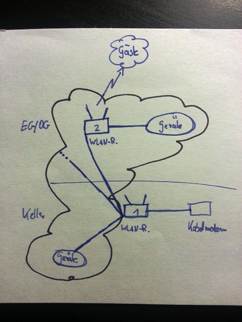 Meine Konfiguration zu Hause beinhaltet bereits einen Gigabit-Router mit WLAN (TP-Link WR-1043ND "alte Art") , dieser soll nun in den Keller. Das "private Netzwerk" wird von dort über Kabel im Haus verteilt. Im Obergeschoss möchte ich nun zusätzlich noch einen Dualband-Router bspw. einen Netgear WNDR3700-100PES anschließen, der als AP dienen und meinen Gästen ein vom "privaten Netzwerk" unabhängiges WLAN - nur Internetzugang - anbieten soll. Das WLAN im Keller soll nur noch nice-to-have sein und reicht von der Lage nicht aus, von dort das Haus bzw. die Gäste zu versorgen.