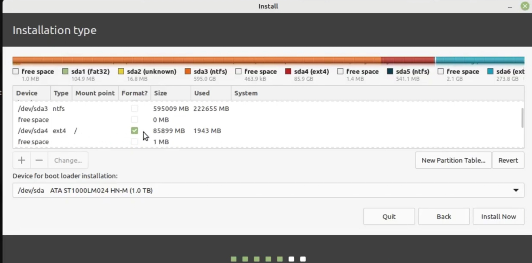 Mit gparted hab ich dann vorsichtshalber die zweite HDD mit ext4 formatiert, dannach hab ich die Installation gestartet. Sprache, Tastaturlayout und Multimediacodecs ausgewählt, dann musste ich im nächsten Schritt die Option "Etwas anderes" auswählen, weil Linux die Windows-Installation auf der anderen (ersten) HDD nicht automatisch erkannt hat.