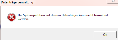 Nun möchte ich eben jenes Auswahlmenü weg haben und mich gleichzeitig von der XP-Platte "trennen", sprich diese formatieren. Für mich schien die einfachste Möglichkeit einfach in den erweiterten Systemeinstellungen das Standardbetriebssystem auf Win7 zu stellen und den Haken bei "Anzeigedauer der BS-Liste" rauszunehmen. Klappt auch soweit wie gewünscht, nur lässt sich das alte XP in der Datenträgerverwaltung nicht formatieren mit der Meldung "Systempartition auf diesem Datenträger kann nicht formatiert werden".