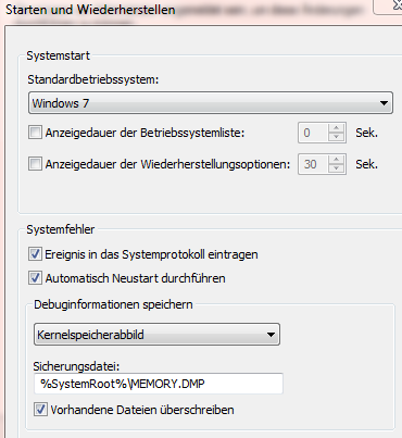 PS: Falls es von Bedeutung sein sollte: in den erweiterten Systemeinstellungen habe ich den Systemstart unverändert gelassen (30 Sek. Anzeige, Default-Start für Win7)