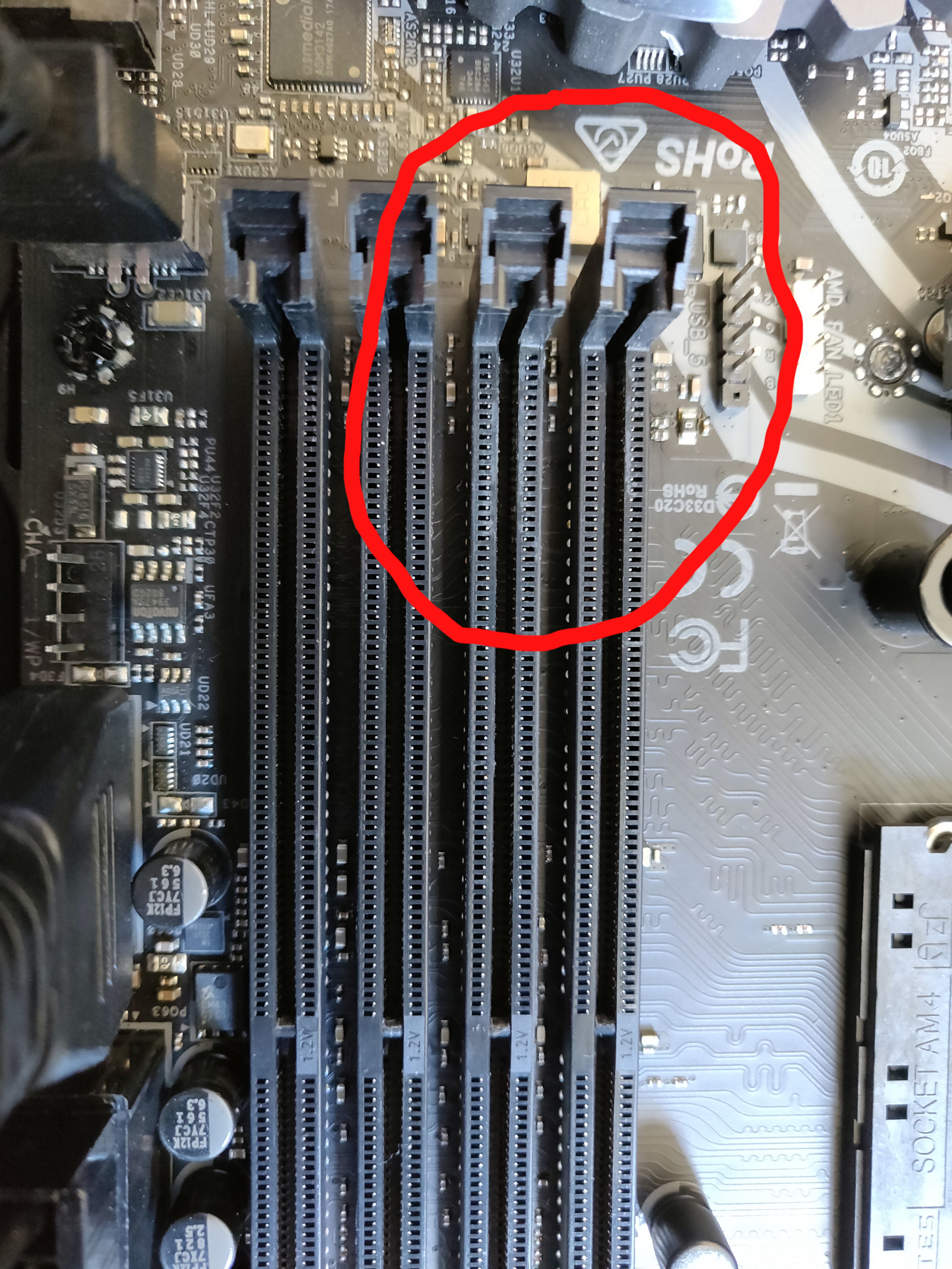 - Nur einen Riegel auf A1, A2, B1 oder B2 installiert und dafür den CMOS reset verwendet -> Rechner bootet nicht und startet ständig neu