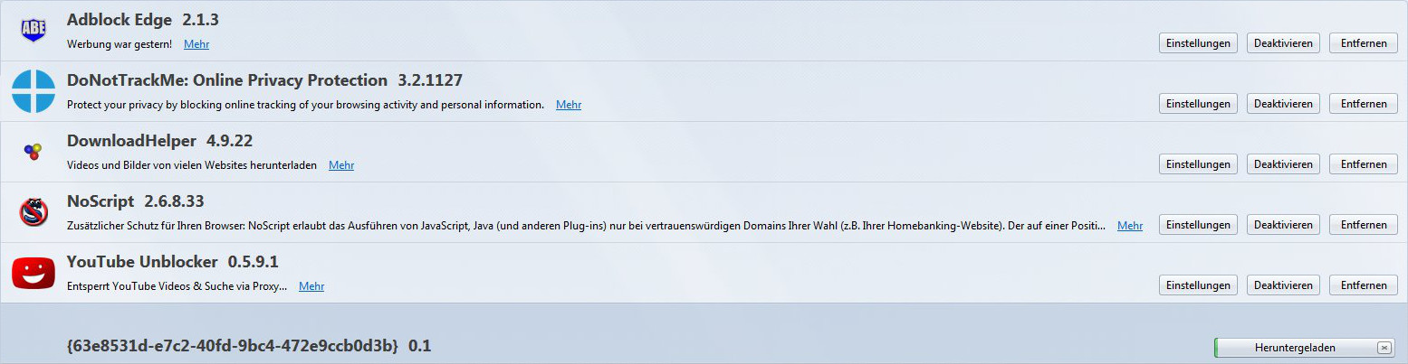 Ich bin jetzt mal der Anleitung zu manuellen Deinstallation gefolgt und das Addon wird nichtmal unter "Informationen zur Fehlerbehebung " unter dem Tab Erweiterungen geführt und es gibt keine ID dafür, da die Datei auch physikalisch nicht im Profil Verzeichnis existiert frag ich mich langsam wirklich was es damit auf sich hat ^^.