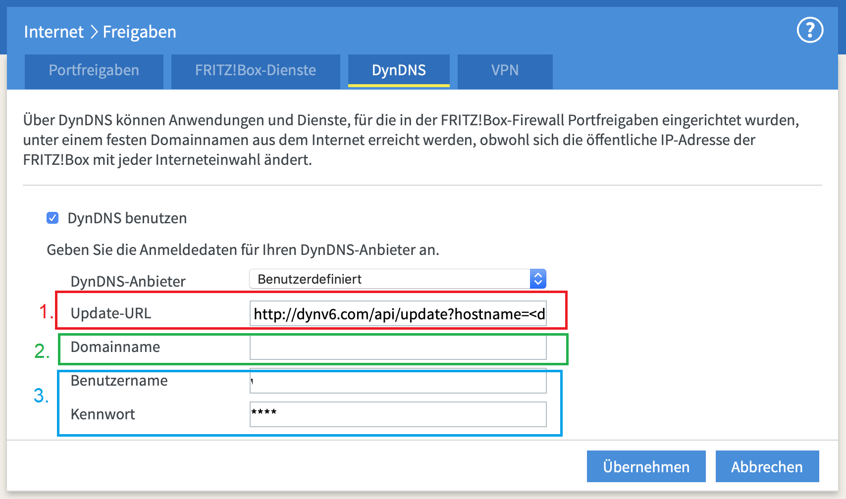 ich wende mich an euch da ich gerne meinen DuckDNS in meine Fritzbox 6490 Cabel implementieren würde aber bei den vorgegebenen Feldern der Maske nicht richtig weis wo was reinkommt.
