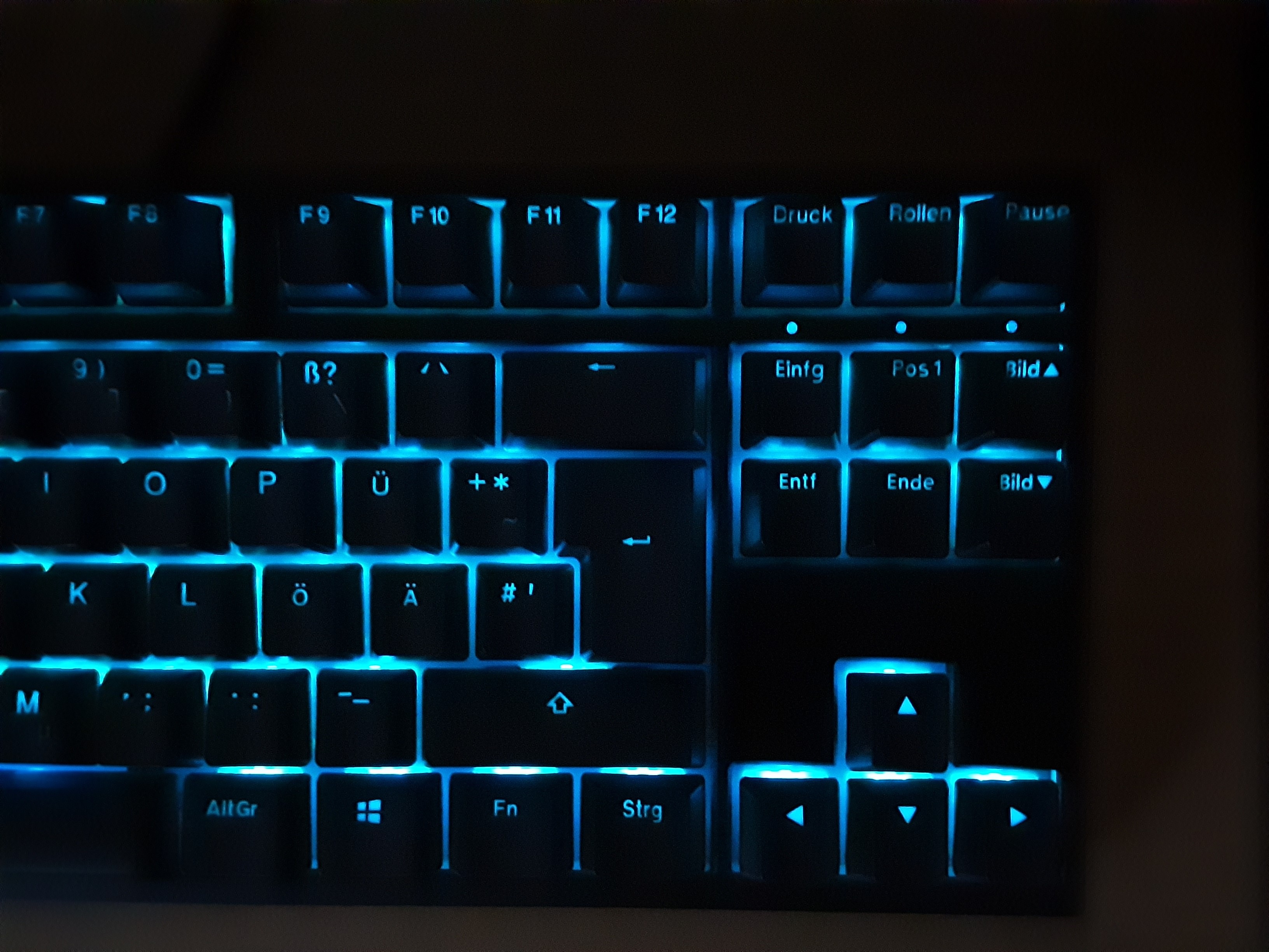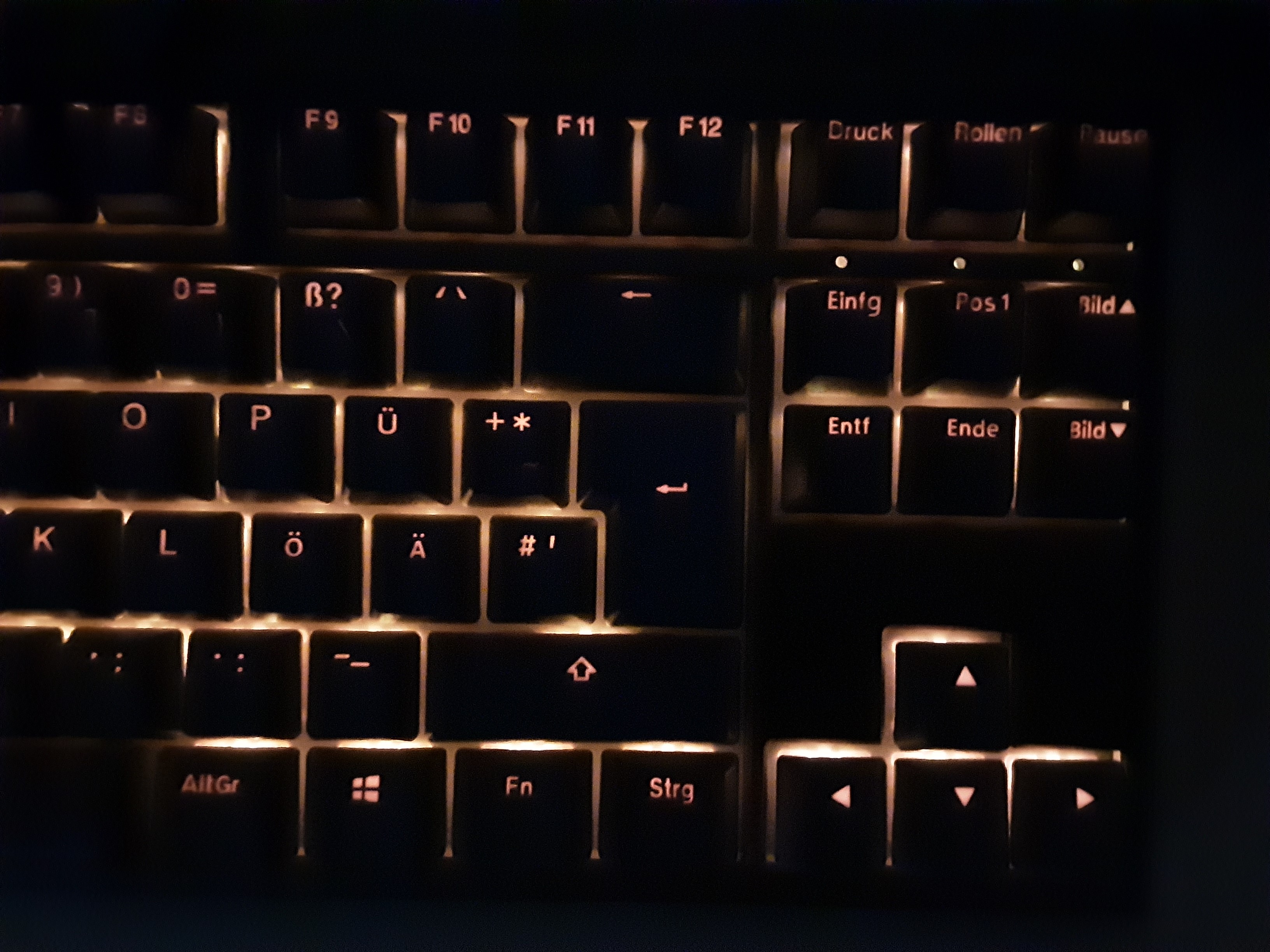 Leider ist meine Tastatur sogar noch schlechter ausgeleuchtet als die aus dem verlinkten Thread. Ich habe versucht ein Foto davon zu machen, aber aus irgendeinen Grund will mein Fotoapparat nicht so wie ich will.