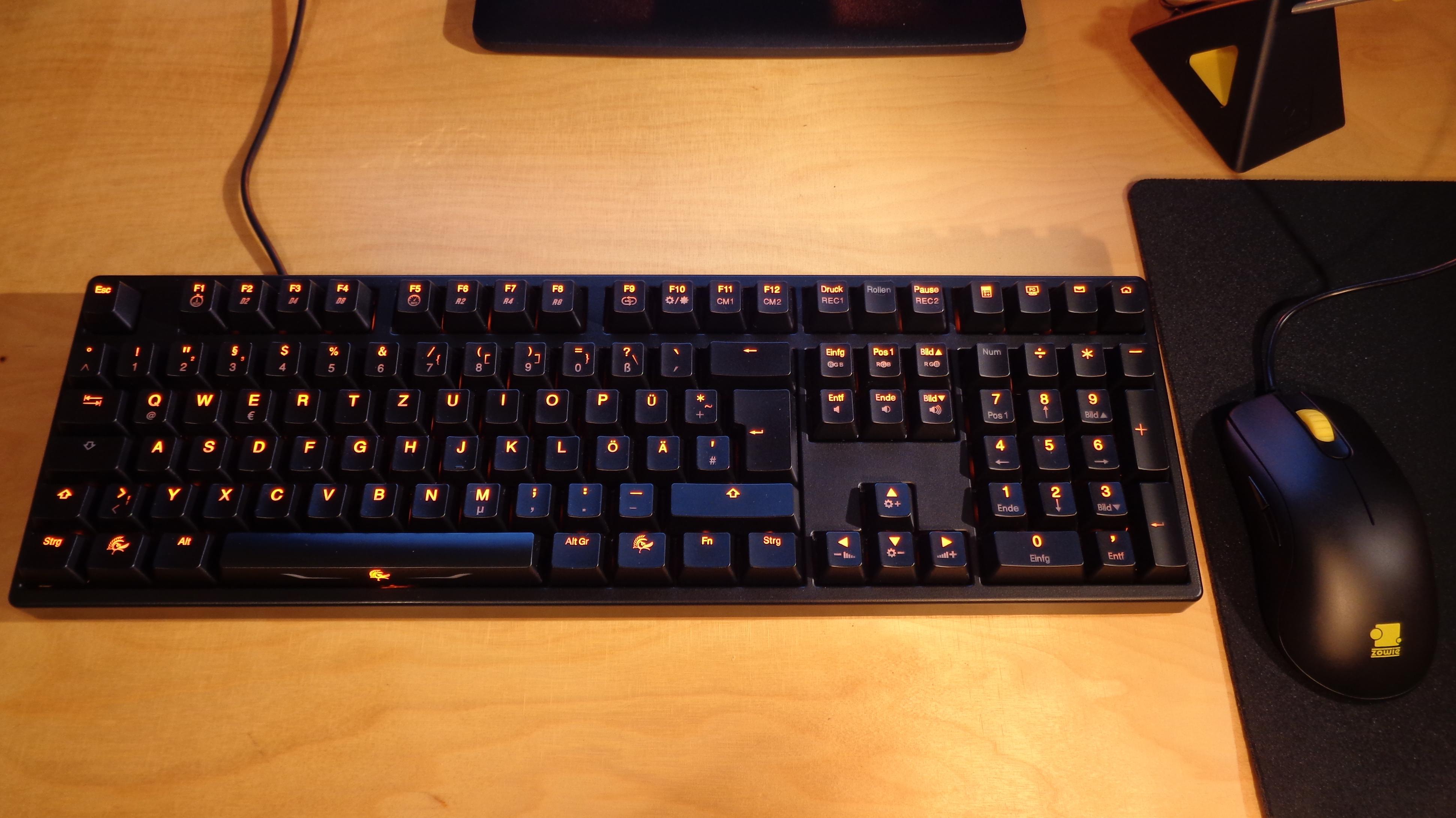 Nimmt man die Shine 3 als vergleichbaren Maßstab, zahlst du außerdem für höherwertige MX-Module statt der Nachbauten von Thermaltake (Kailh Blue der billigen Art), zusätzliche 109 LEDs in der zweiten Farbe, netterem Kunststoff/besserer Verarbeitung, Dual-Layer-PCB und die Konfigurationsoptionen. Muss man nicht brauchen oder für nötig halten, kostet aber auch irgendwo