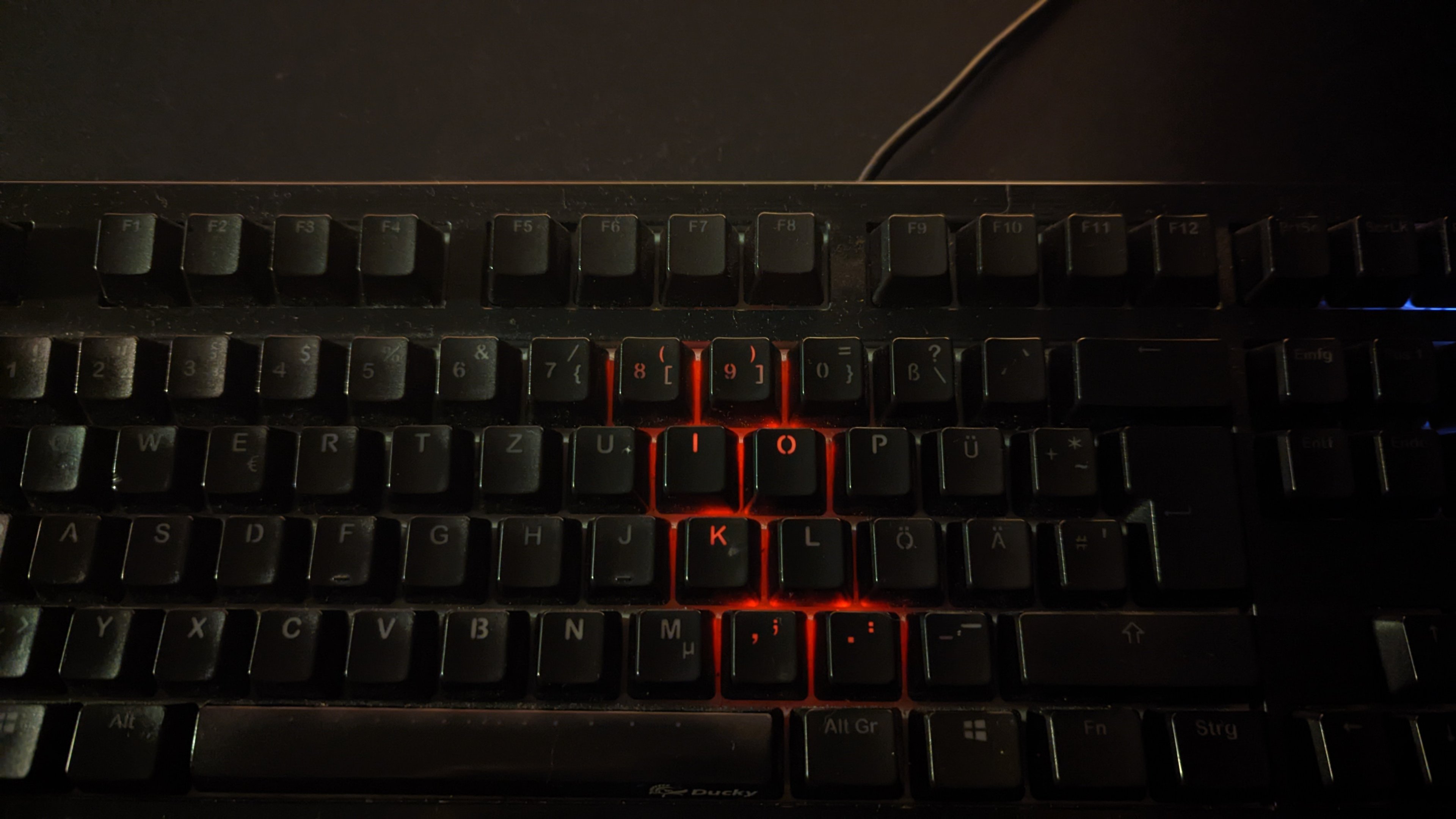 ich habe seit vorgestern ein komisches Problem mit einer schon einige Jahre alten Ducky Shine 5: Die folgenden Tasten leuchten fast dauerhaft rot auf: