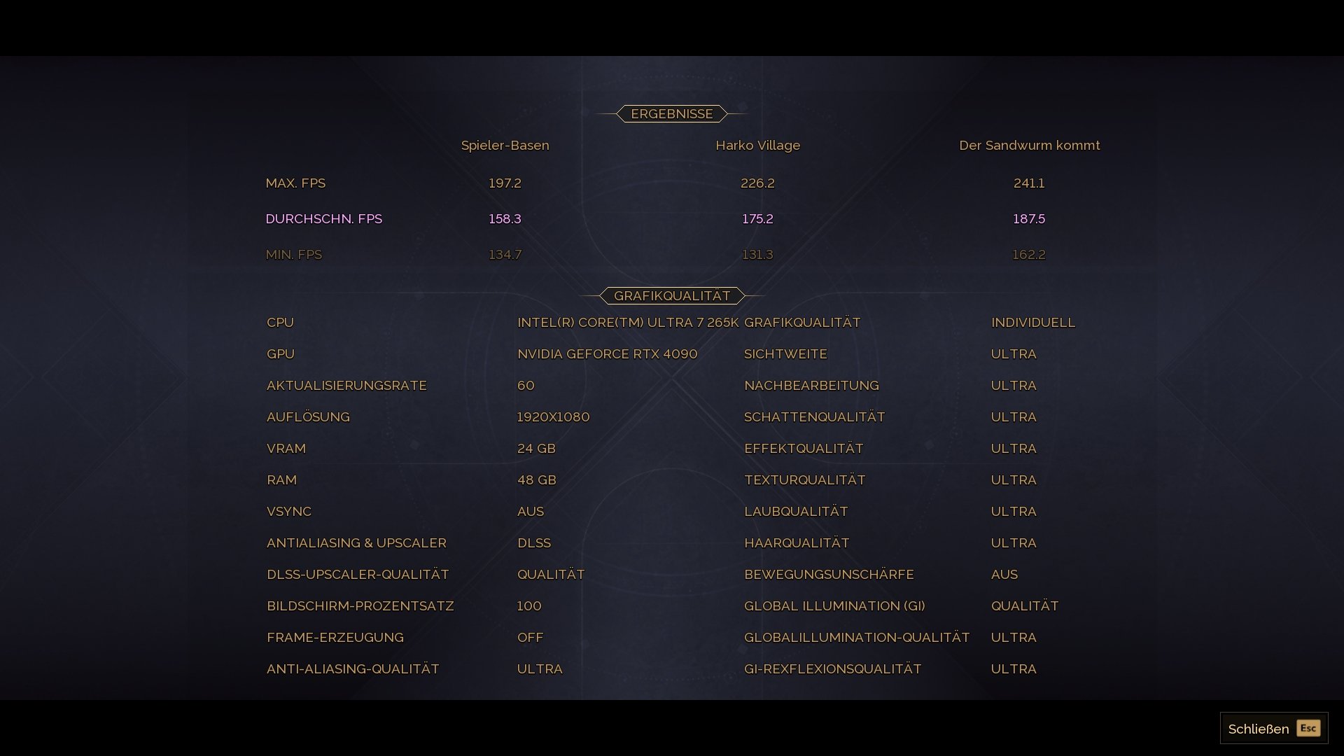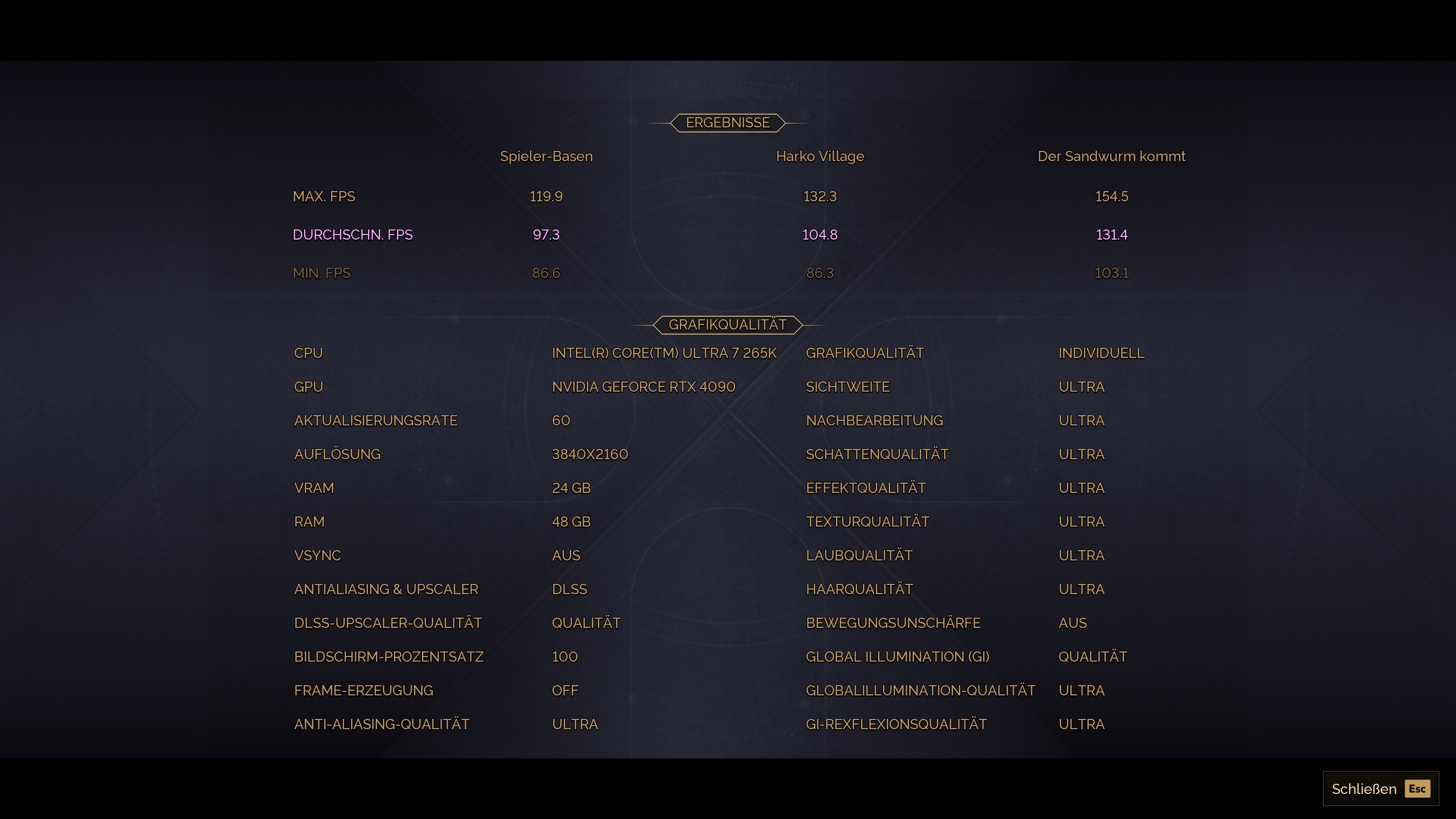 3.840 × 2.160, „Ultra“, DLSS/FSR Quality, FG Aus – AVG-FPS Spieler-Basen: 19,4
