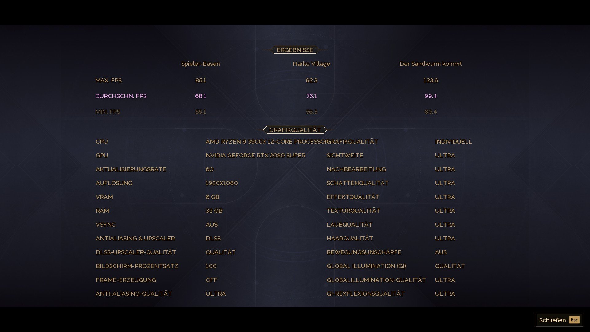 3.840 × 2.160, „Ultra“, DLSS/FSR Quality, FG Aus – AVG-FPS Spieler-Basen: 101