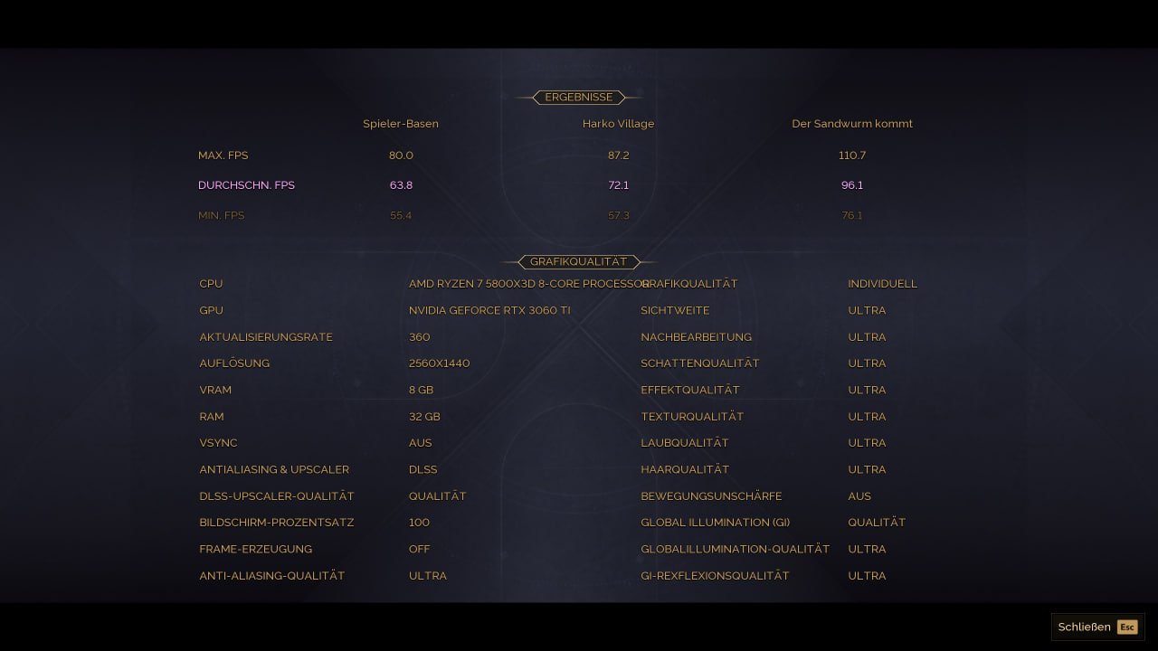2.560 × 1.440, „Ultra“, DLSS/FSR Quality, FG Aus – AVG-FPS Spieler-Basen: 142,5