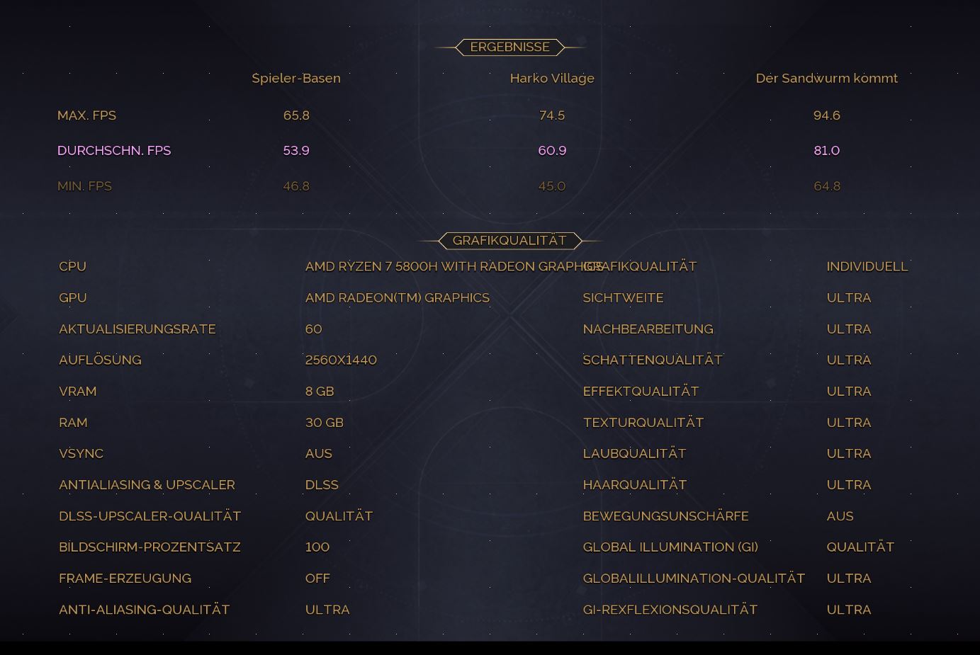 Mein Setup, Ryzen 5800H mit RTX3070, kann in dem Benchmark DLSS & FSR nutzen.