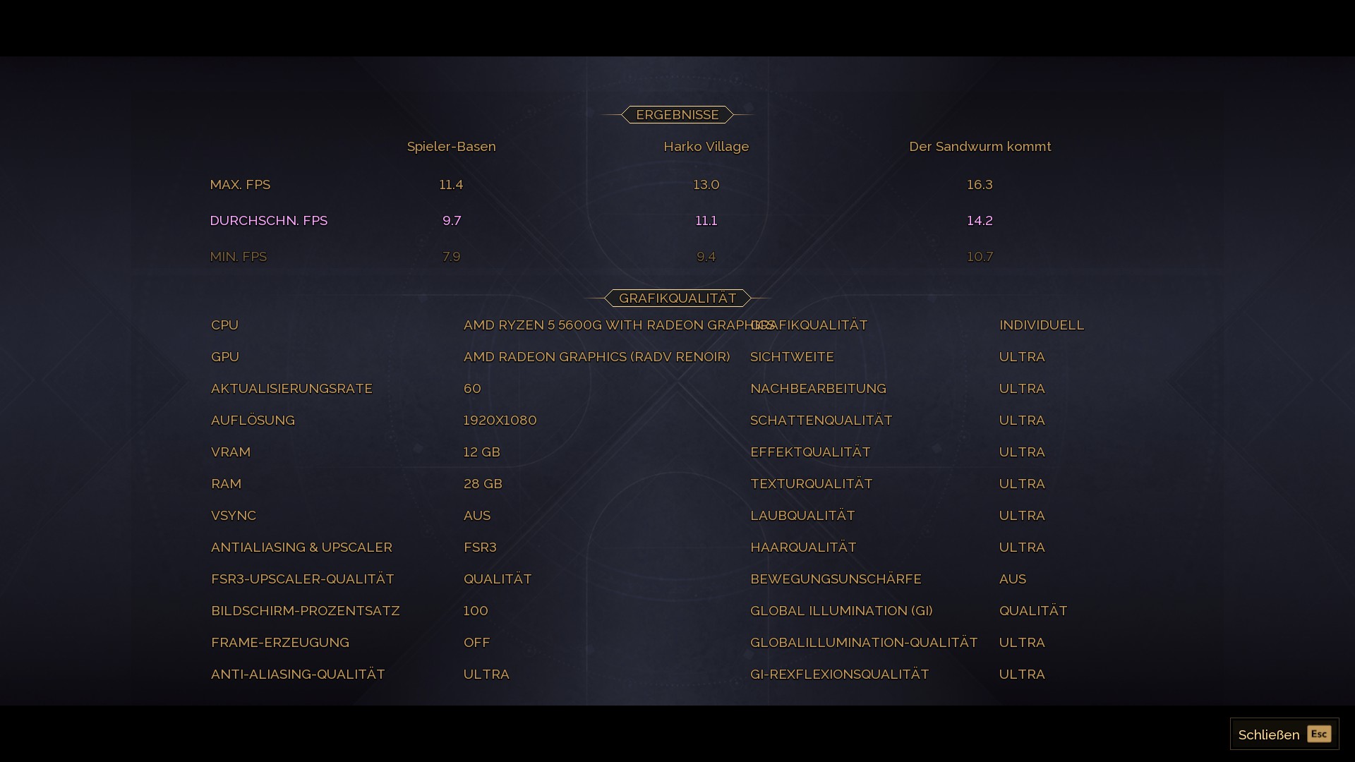 Brauchte 3 Versuche für den 4k-Benchmark, weil das Programm - wahrscheinlich wegen VRAM-Mangel - zweimal abgeschmiert ist. Dabei wurde einmal ein Absturzbericht an Funcom generiert, der mich gefragt hat, was ich denn da gemacht habe. Da hab ich natürlich wahrheitsgemäß geantwortet, dass ich das Ding "mit 4k und Ultra-Settings auf nem Steam Deck durchlaufen lassen wollt, was denn sonst! Völlig normaler Use Case." Ich denke, dadurch wird das Spiel jetzt nochmal extra gründlich optimiert.