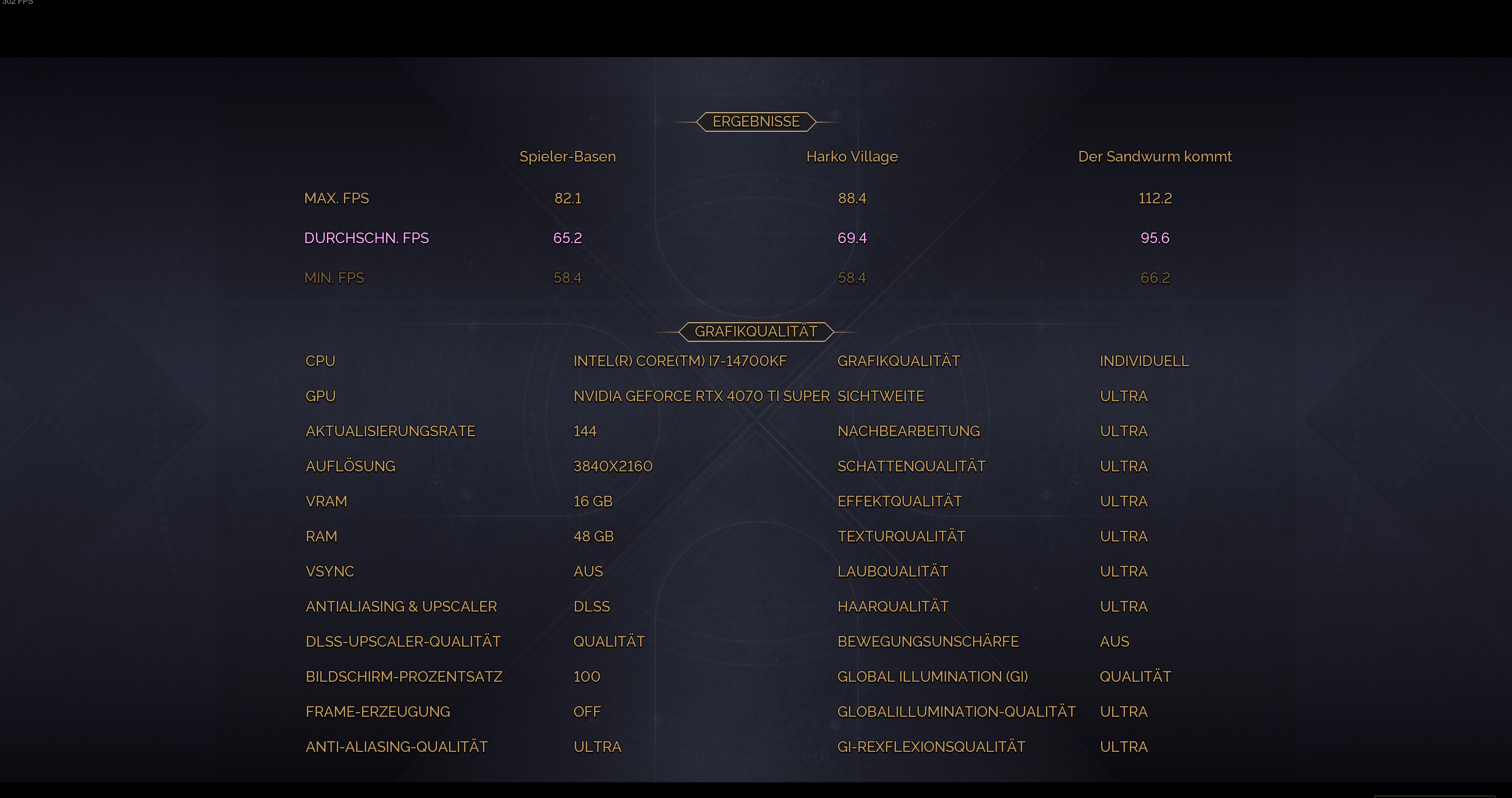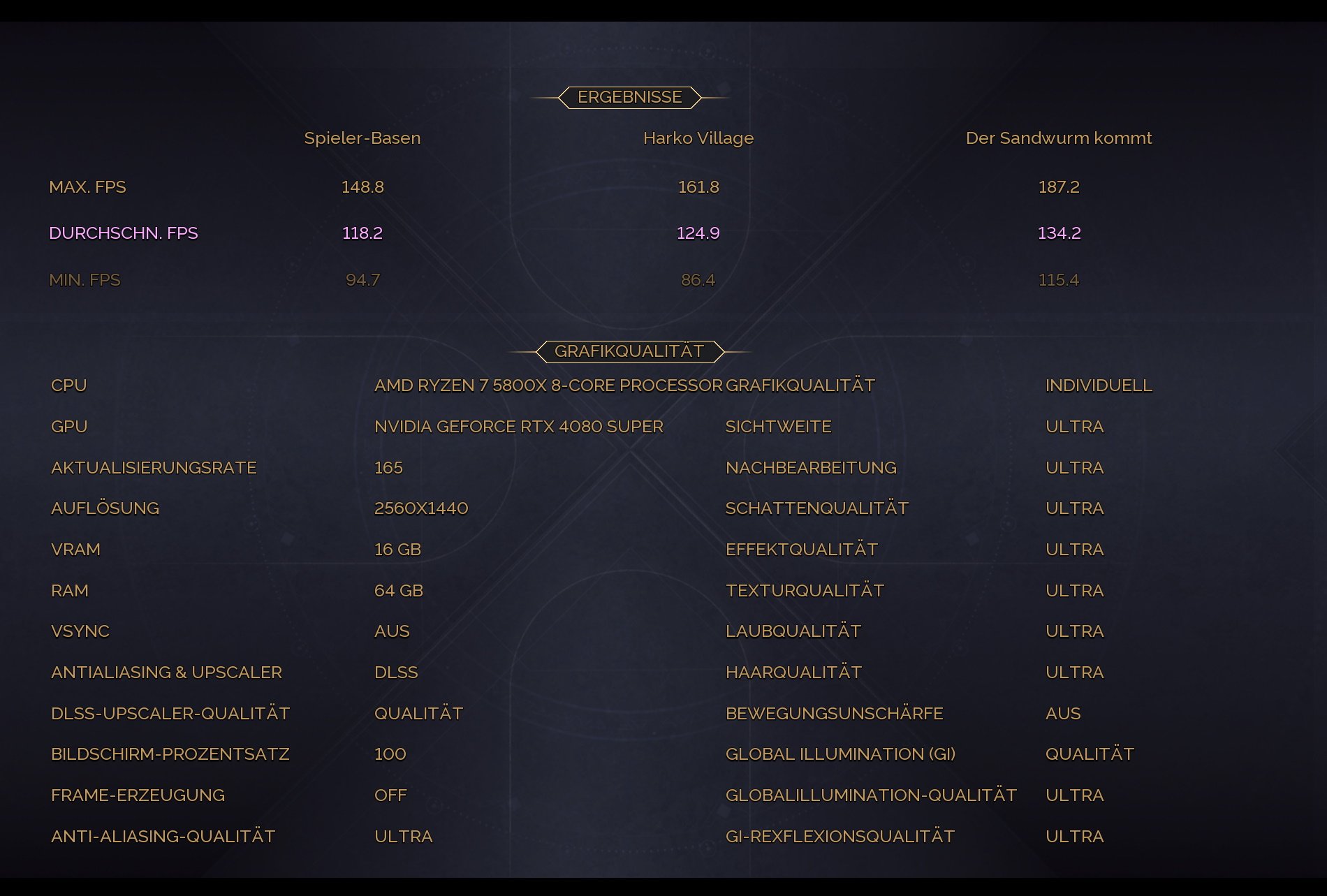 2.560 × 1.440, „Ultra“, DLSS/FSR Quality, FG Aus – AVG-FPS Spieler-Basen: 9,5