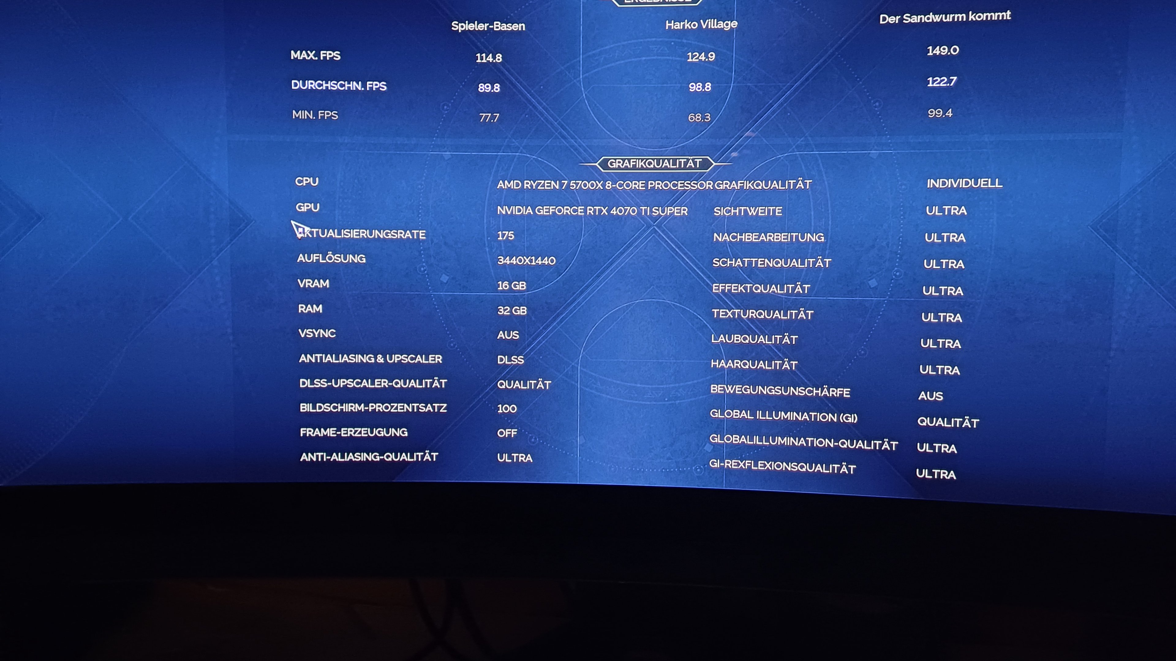3.440 × 1.440, „Ultra“, DLSS/FSR Quality, FG Aus – AVG-FPS Spieler-Basen: 76,7