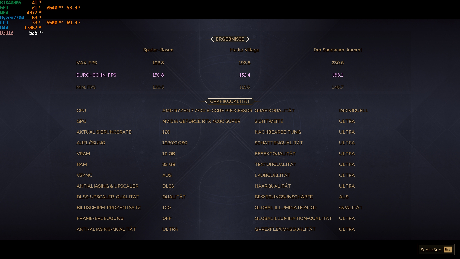 1.920 × 1.080, „Ultra“, DLSS/FSR Quality, FG Aus – AVG-FPS Spieler-Basen: 60,6