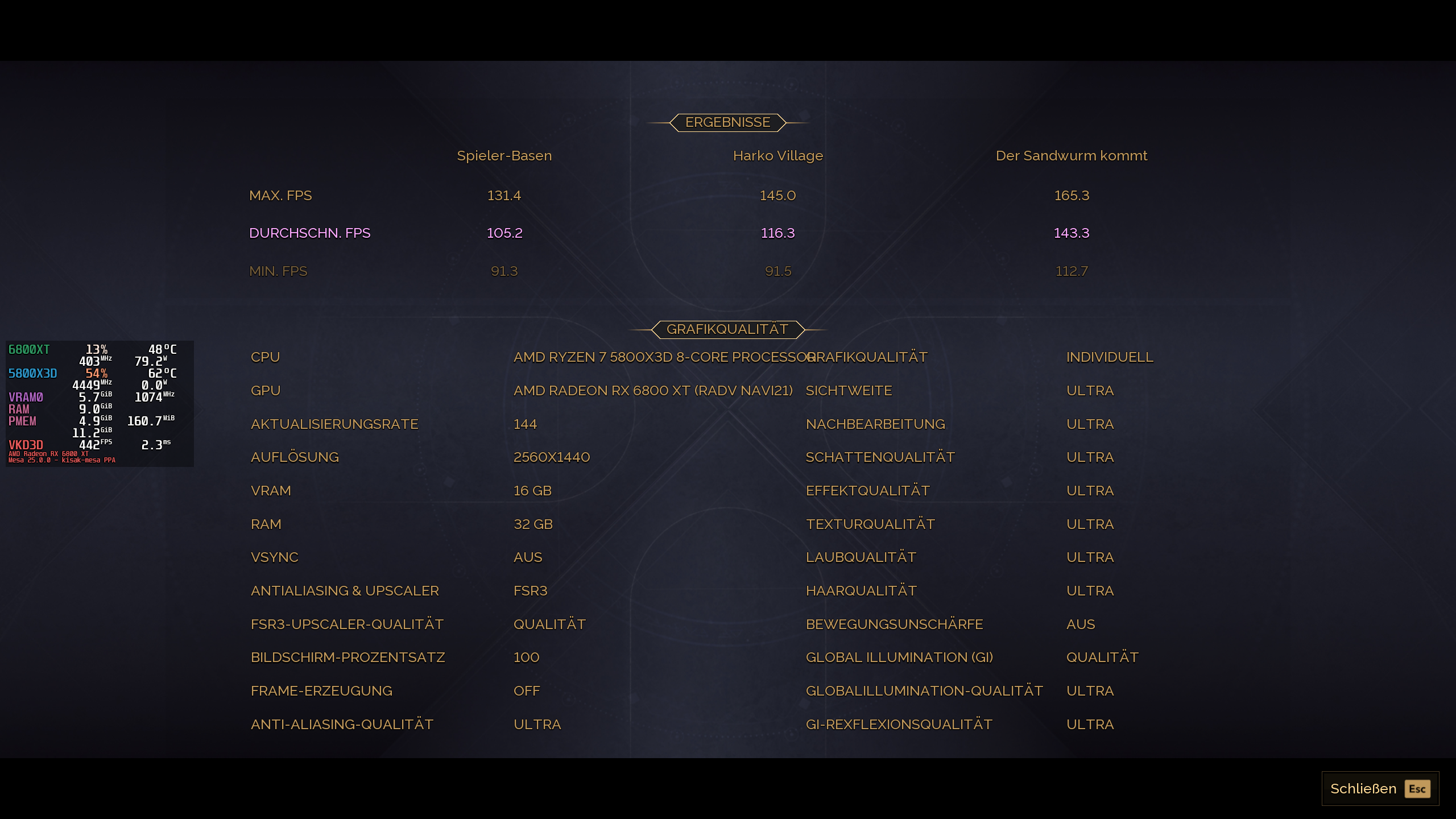 2.560 × 1.440, „Ultra“, DLSS/FSR Quality, FG Aus – AVG-FPS Spieler-Basen: 143,9