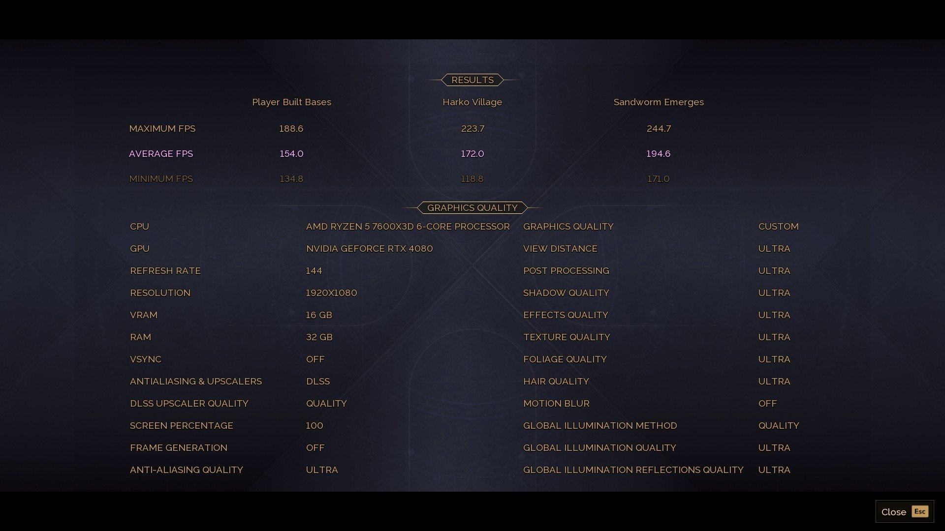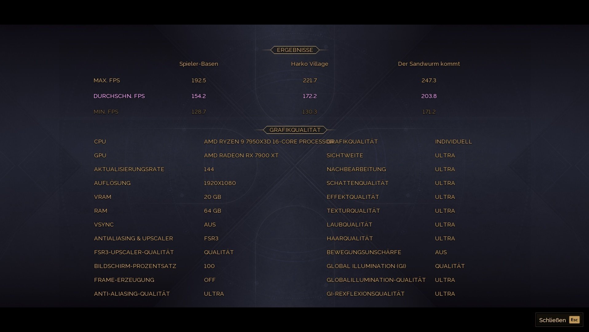 1.920 × 1.080, „Ultra“, DLSS/FSR Quality, FG Aus – AVG-FPS Spieler-Basen: 145,6