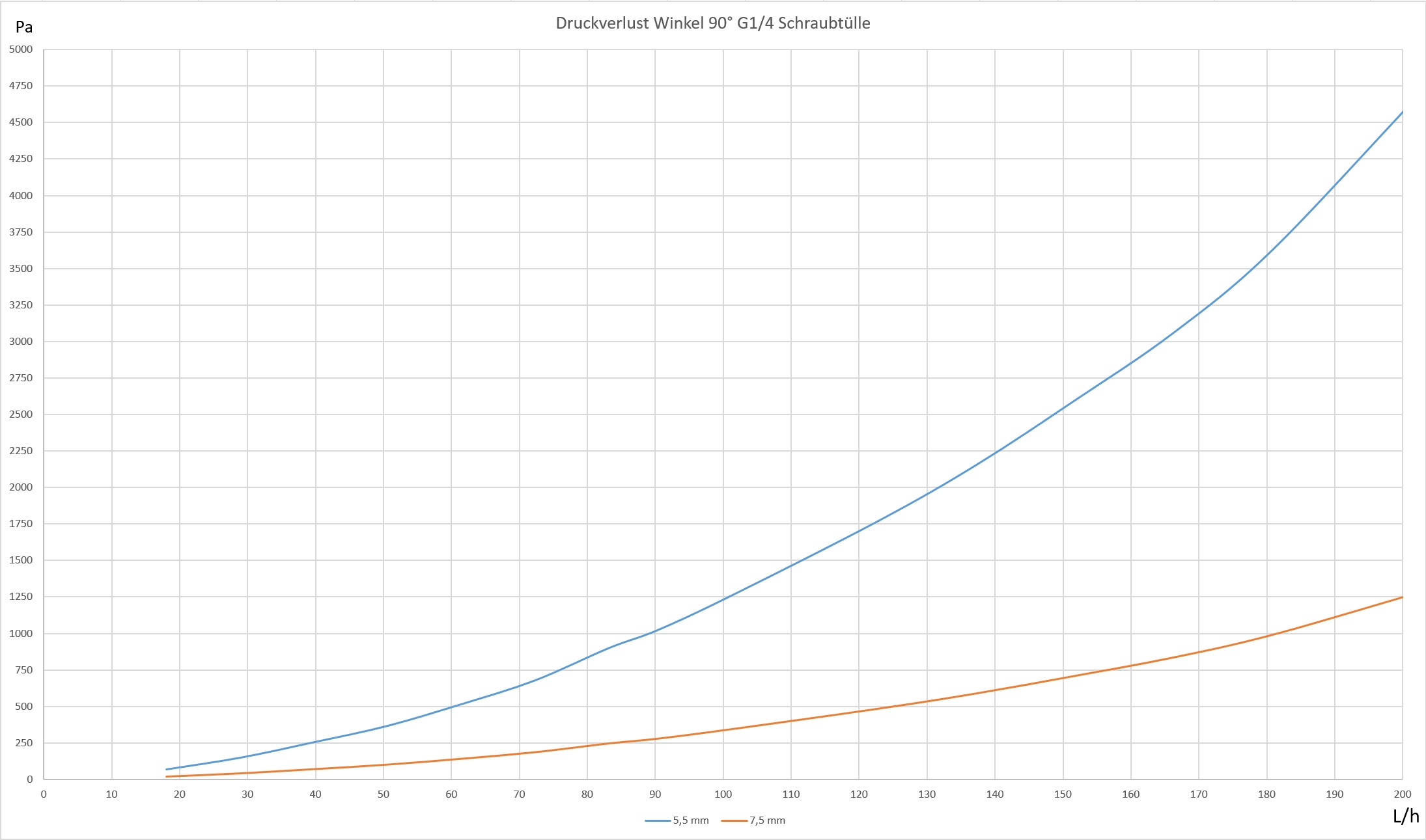 Druckverlust bei 100 L/h pro 100 mm gerades 8 mm Rohrstück 50 Pa.