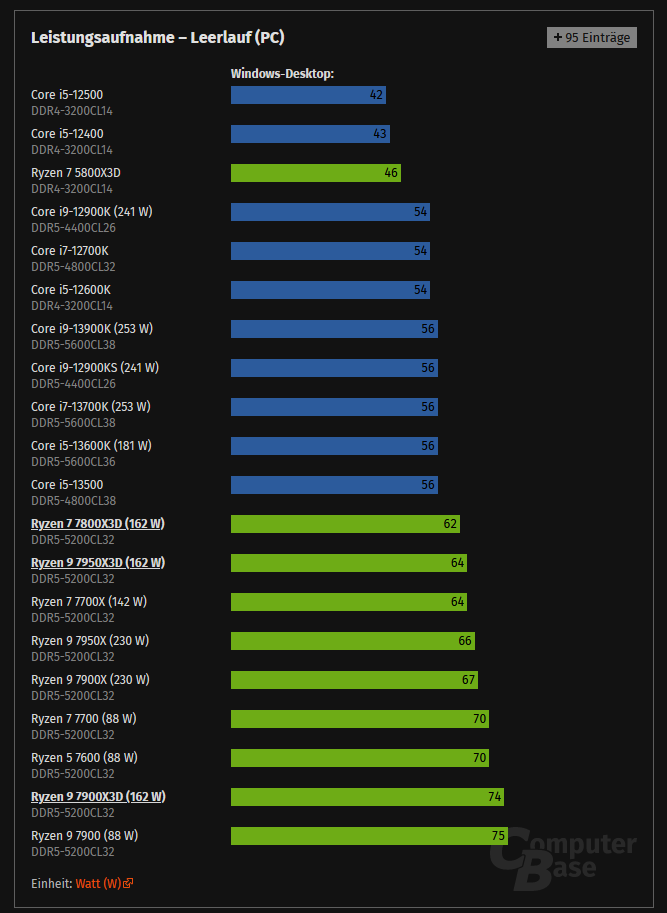 Ich habe als aktuelle Intel CPU nur ein Notebook und das kommt minimal so auf 10-15W CPU(13700H) und 30-50W an der Steckdose....im Akkubetrieb insgesamt 14W(aus der Akkulaufzeit errechnet.