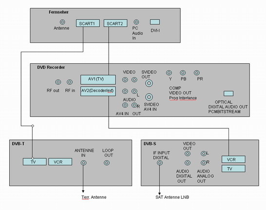DVD Recorder: SCART(AV1) --> Fernseher SCART(AV2), SCART AV2(Decoder/ext) --> DVB-S SCART VCR