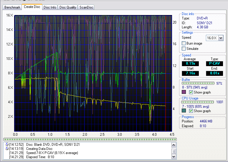 Für eine DVD+R mit 4,3 GB braucht der 45 minuten, früher war das viel schneller.