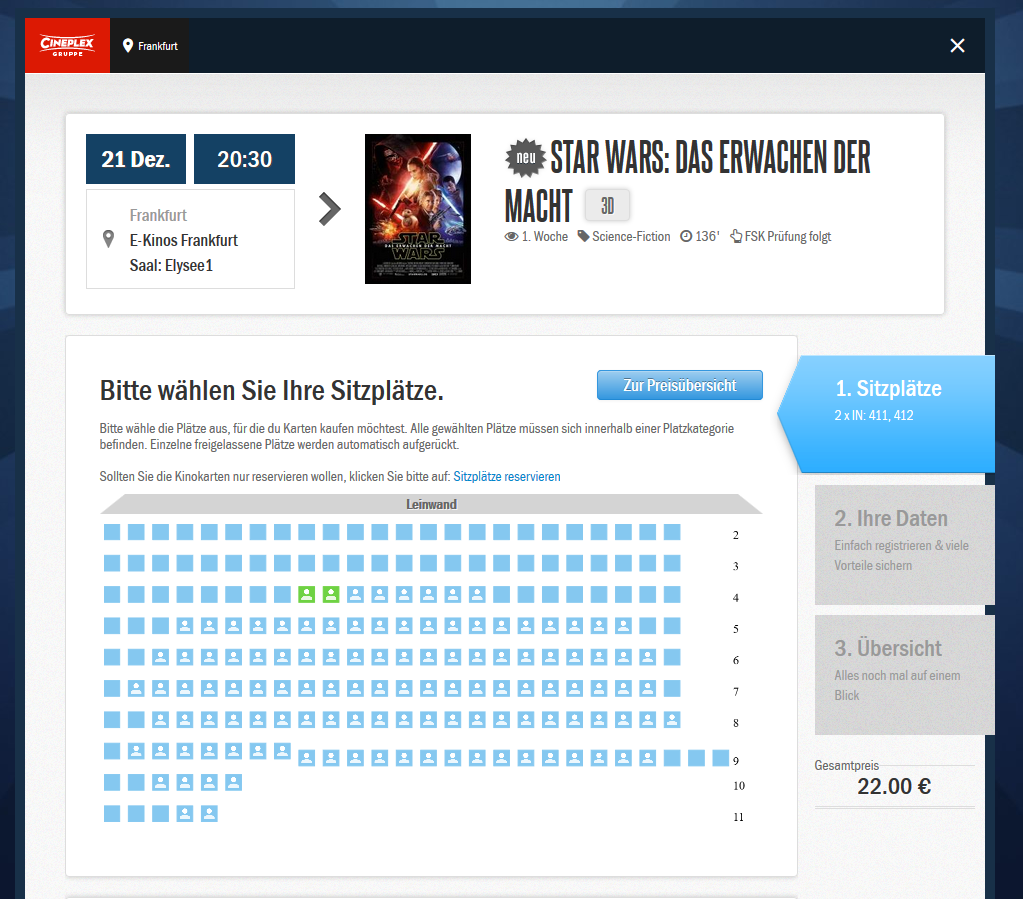 vor Weihnachten bekommen, vernünftige Sitzplätze waren nur noch in einen kleineren Kino 40 KM von