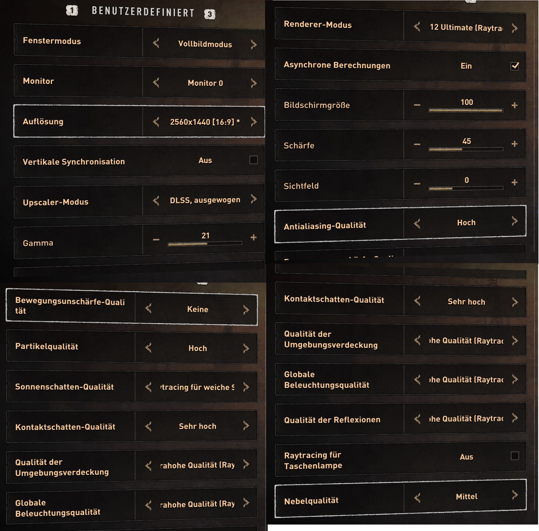 So, mal kurz anfangen zu spielen, so richtig werde ich erst heute Abend loslegen. Nutze diese Einstellungen. Hab es auch mit DLSS Qualität versucht, dann bin ich zu oft in den 60er und das finde als nicht mehr besonders flüssig. Wie schnell man sich doch an sehr hohe FPS Werte gewöhnen kann.