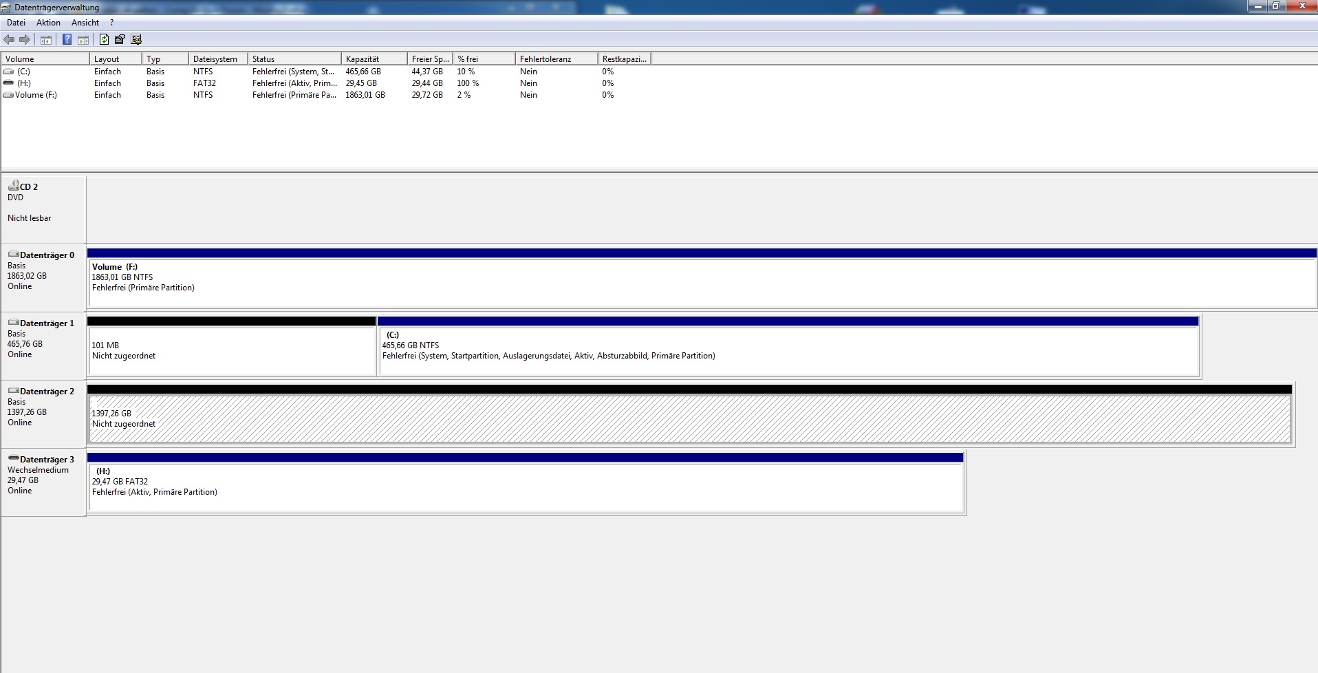 Ich habe eine volle 500GB C: Partition (wollte Daten da kurz zwischenlagern für das neue D:), ein leeren Datenträger 2 (1379,26GB) und F: mit 1863,01 GB (ist aber voll...)