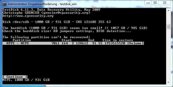 Am Ende des Scans erscheint jedoch eine Fehlermeldung: „Check the harddisk size: HD jumpers settings, BIOS detection, OS limitation... The following partition can't be recovered. The harddisk seems too small!”