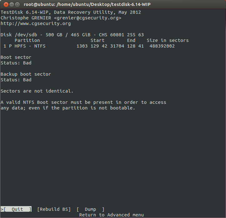 Drittens könnte der Teil mit den wichtigen Daten sein, Bootsector sind jedoch beide "Bad", Wiederherstellung des Bootsectors schafft Testdisk da nicht.