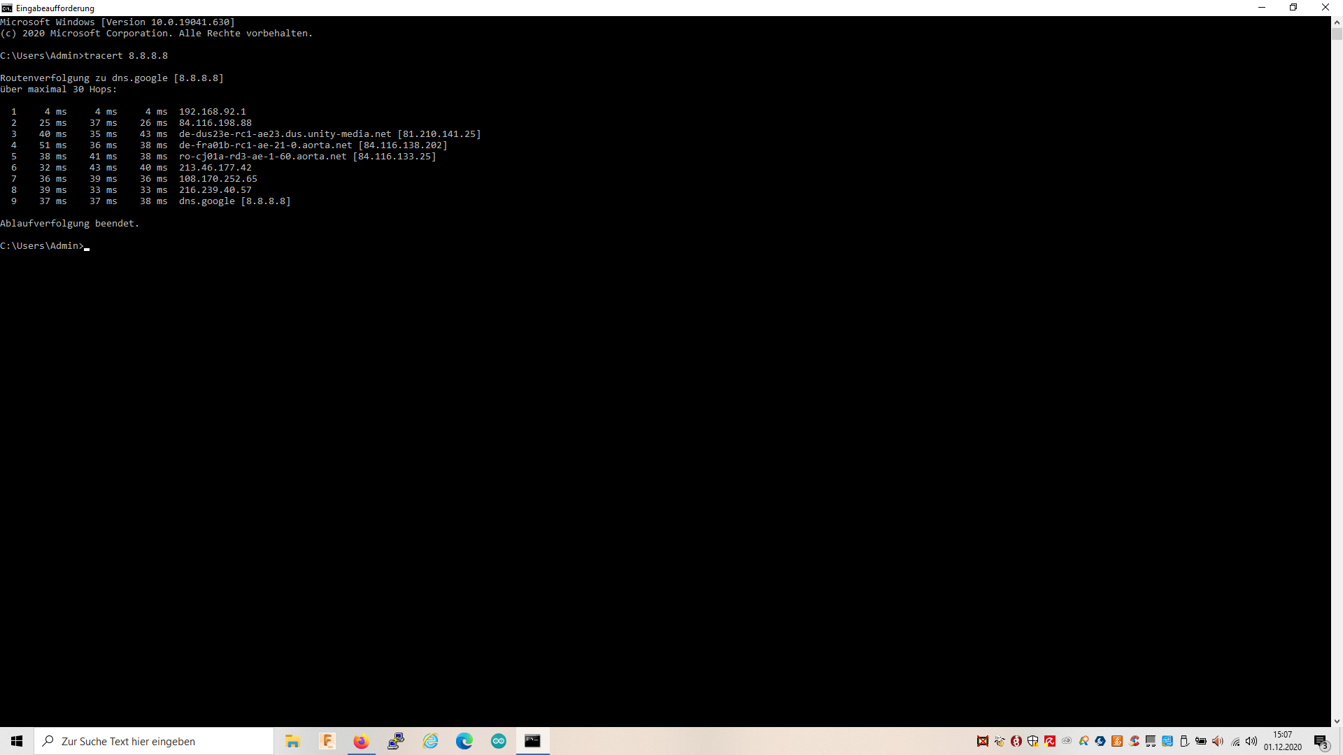 Der erste Hop sollte die lokale IP-Adresse der Connect Box sein (ab Werk 192.168.0.1), der zweite Hop ist dann das Gateway bei deinem Provider und vermutlich eine IP aus 100.64.0.0 -100.127.255.255, ab dem 3. Hop gehts dann entweder noch weiter durch das Provider-Netz oder schon ins www über andere Provider bis der Trace bei Hop x bei 8.8.8.8 ankommt.