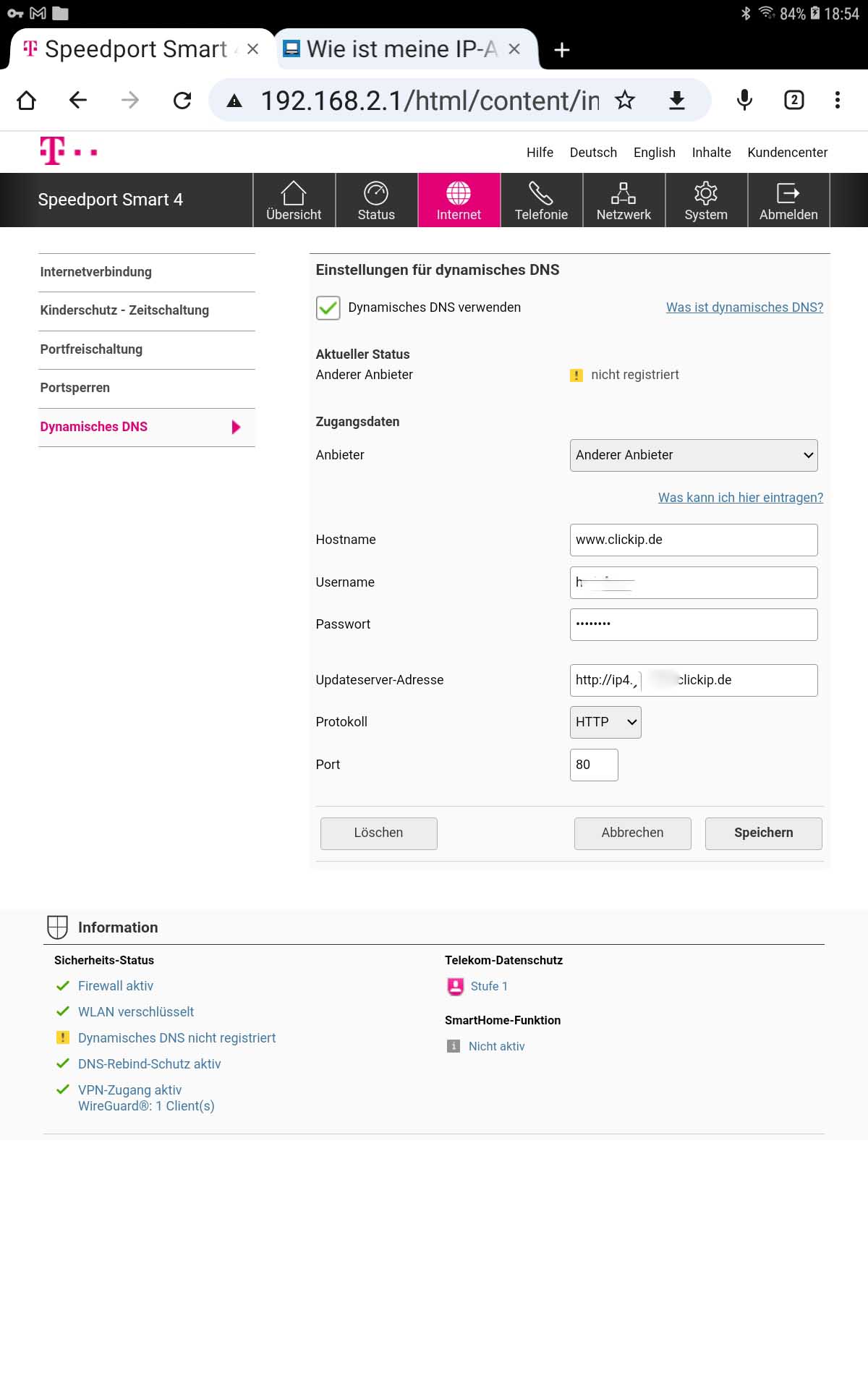 Versuche gerade ein Wireguard vpn beim Speedport Smart 4 am Telekom Account einzurichten.