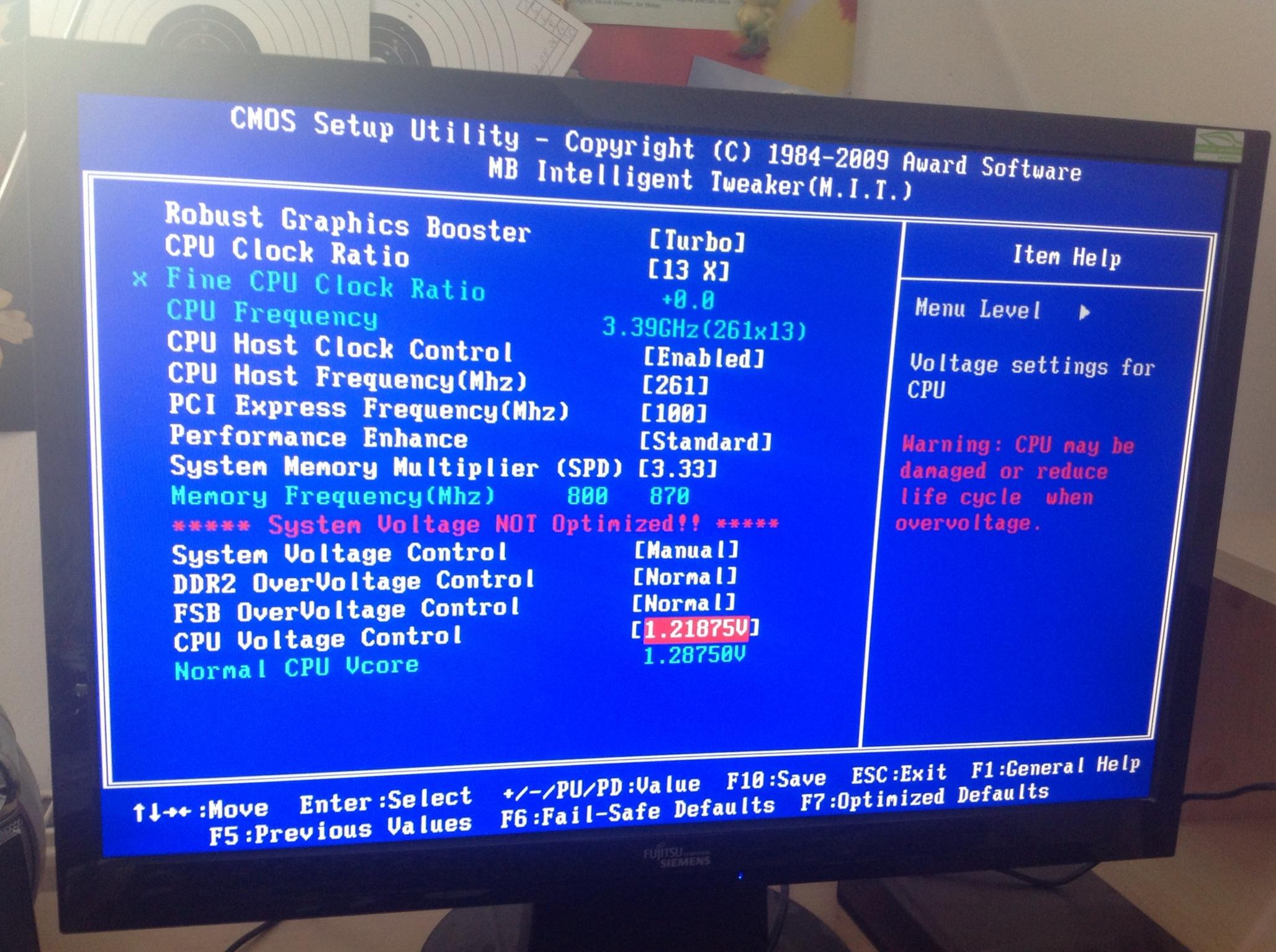 Im Anhang habe ich meine Bios-Einstellungen abphotografiert und ein Bild meiner Hardware. Da mein Multi fix ist, habe ich über den FSB übertaktet. Allerdings will mein PC bei FSB>261 nicht mehr starten, auch wenn ich den Multi runterdrehe. Bei einer Erhöhung auf 260 kann ich sogar die Spannung etwas absenken, und die Temperatur bleibt IMMER unter 55°, selbst bei 30 Grad Zimmertemperatur.