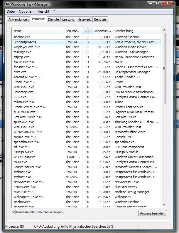 extasy schrieb:Übrigens liegt meine Systemauslastung trotz eingeschalteter Sidebar und Indizierungsdientes im Leerlauf (also wenn nichts gemacht wird, auch die Maus nicht bewegt wird)bei 0-1%, daran kann es also definitiv nicht liegen wie hier immer behauptet wird.
