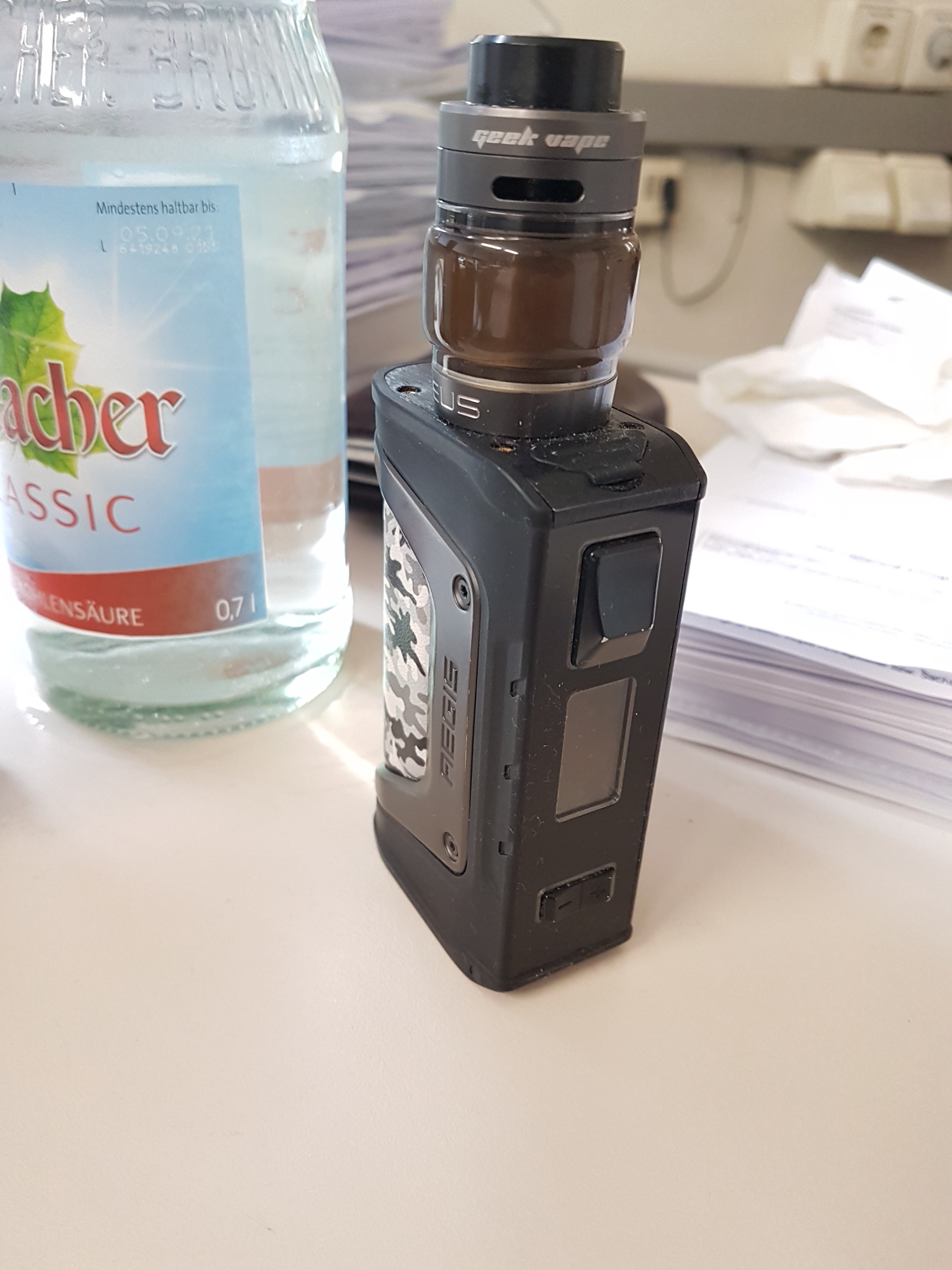 Geek Vape Aegis Legend. Relativ kompakt und unzerstörbar, betreibe ihn selbst mit dem Zeus Dual. Man muss ihn ja nicht in Camo nehmen, dann kommt er auch dezent daher.