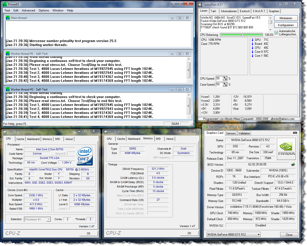 Bei 3,33Ghz konnte ich die CPU noch undervolten (1,26V laut CPU-Z unter prime, 1,325 in BIOS). Ich steuere meine Lüfter über Speedfan (die Lüfter versuchen die Cores bei max 63°C zu halten) und habe nicht den Anspruch die HW auf Zimmertemperatur runterzukühlen, sondern den Rechner möglichst lautlos zu machen: selbst unter Last drehen die Lüfter gerade mal zu 50-60% auf - das hört man überhaupt nicht. Die CPU läuft primestable über 3h - scheine ich echt Glück mit gehabt zu haben. Ein Kumpel braucht mit der gleichen Kiste bei 3,2Ghz schon 1,40V!