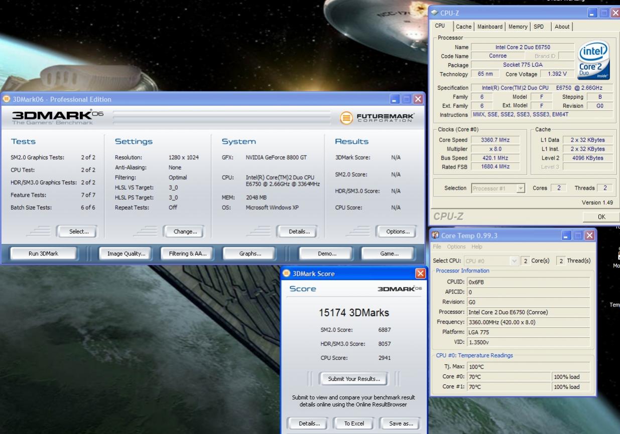 Ich finde er arbeitet jetzt schon etwas flotter. Hatte im 3DMark 06 mit 3,0 Ghz 13959 Punkte. Der Unterschied zu deinem System ist wohl durch meinen SLI Verbund (2xMSI 8800GT OC) zu erklären. Ich habe bei den momentanen 3.36Ghz im BIOS noch die NB Voltage auf 1.35 V angehoben. Werde dann jetzt erst mal den neuen Lüfter ordern.
